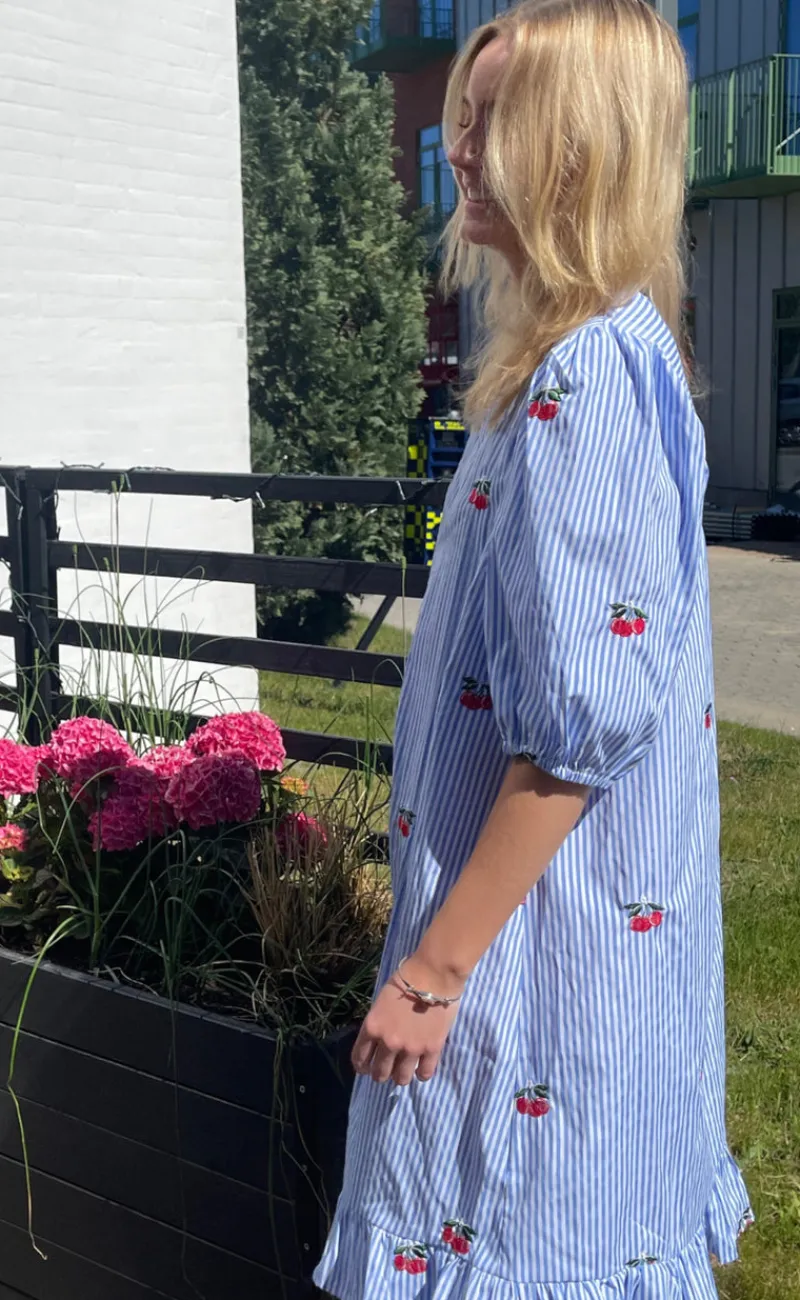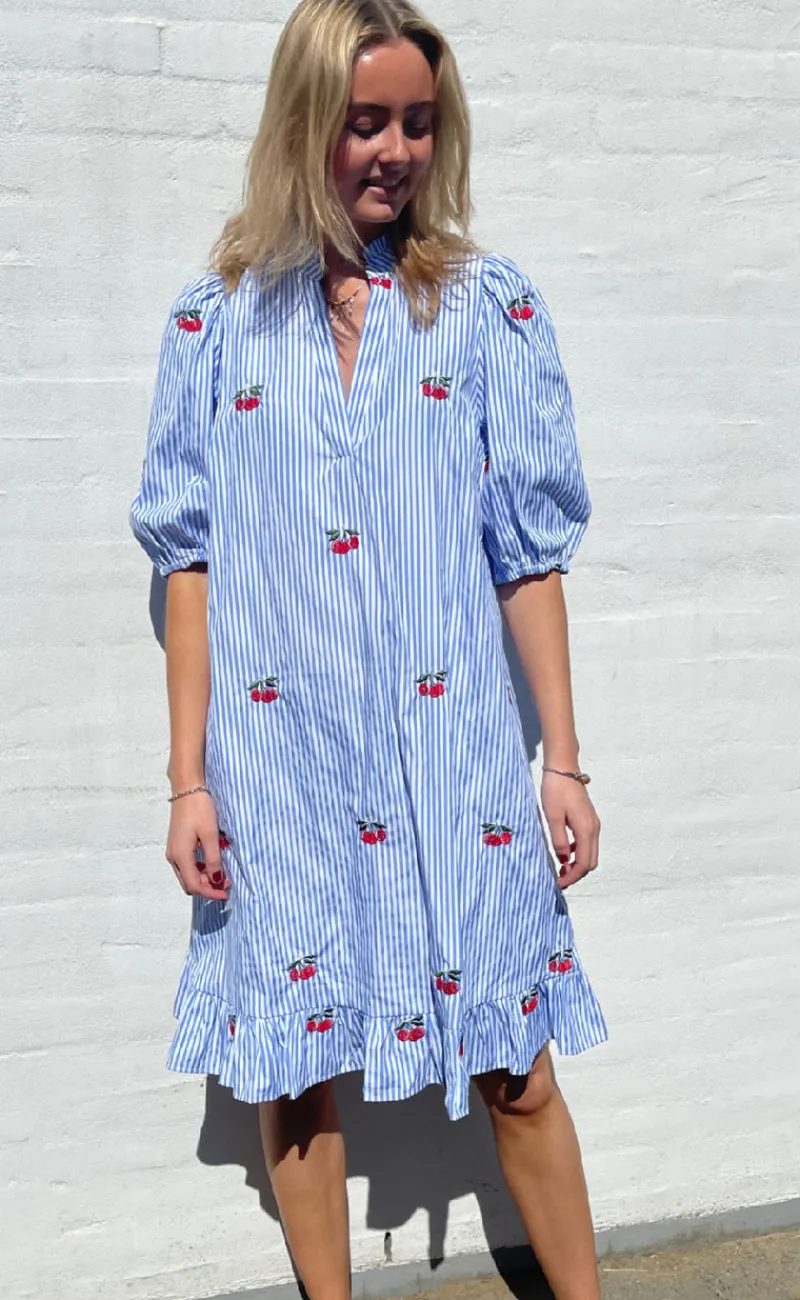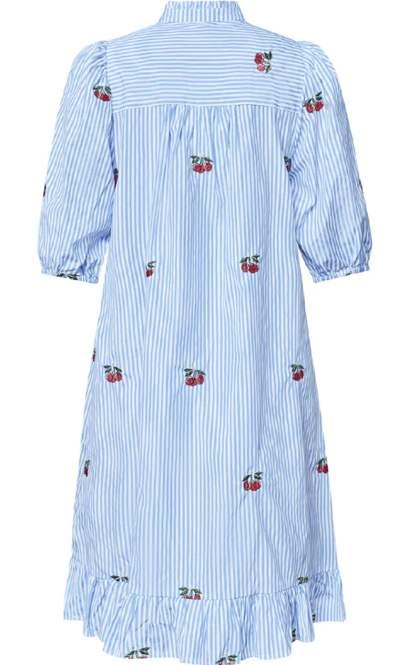 Sød kjolen fra Love & Divine i et blå stribet print, med små søde kirsebær fordelt rundt på kjolen.