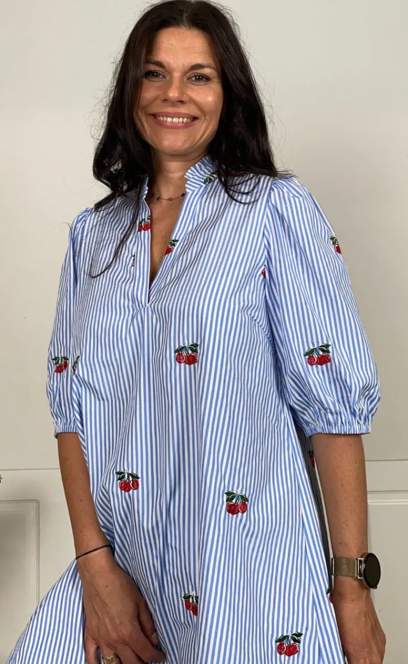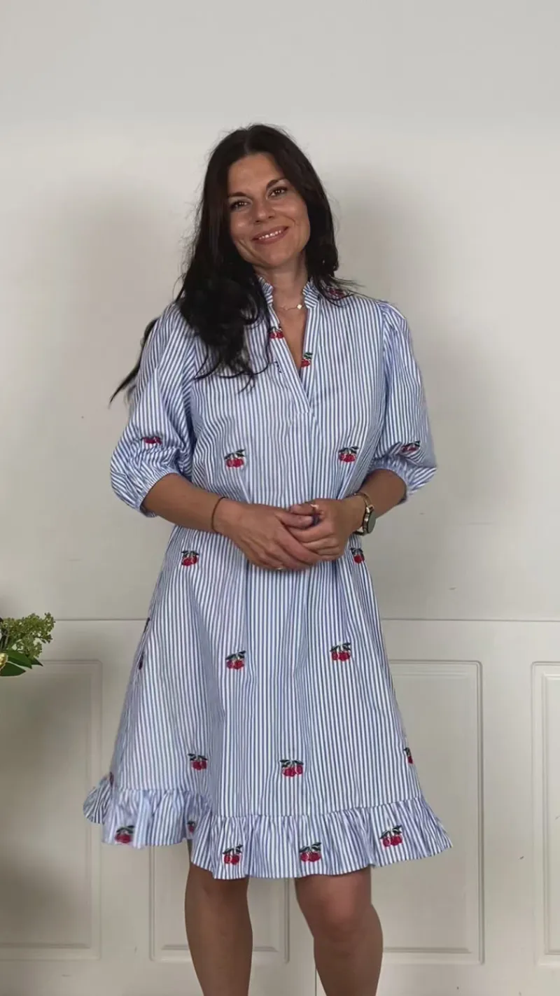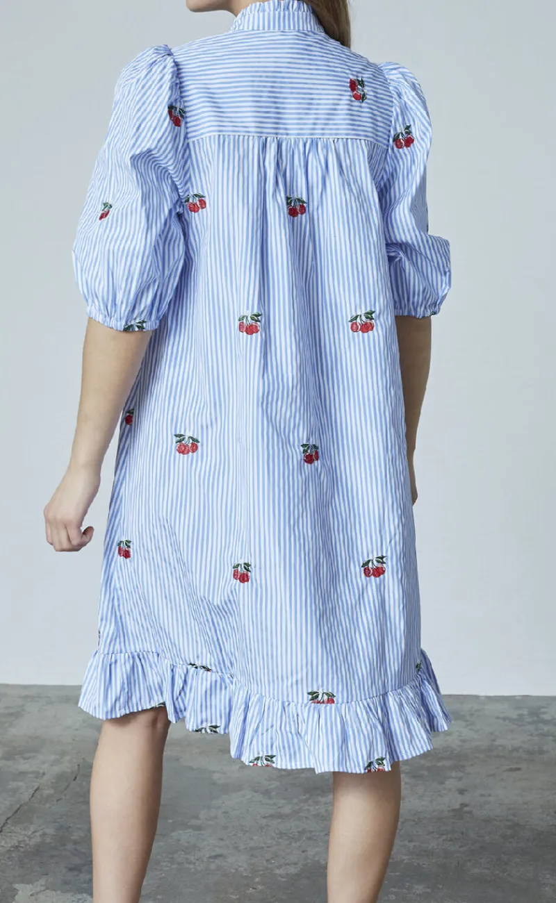 Sød kjolen fra Love & Divine i et blå stribet print, med små søde kirsebær fordelt rundt på kjolen.