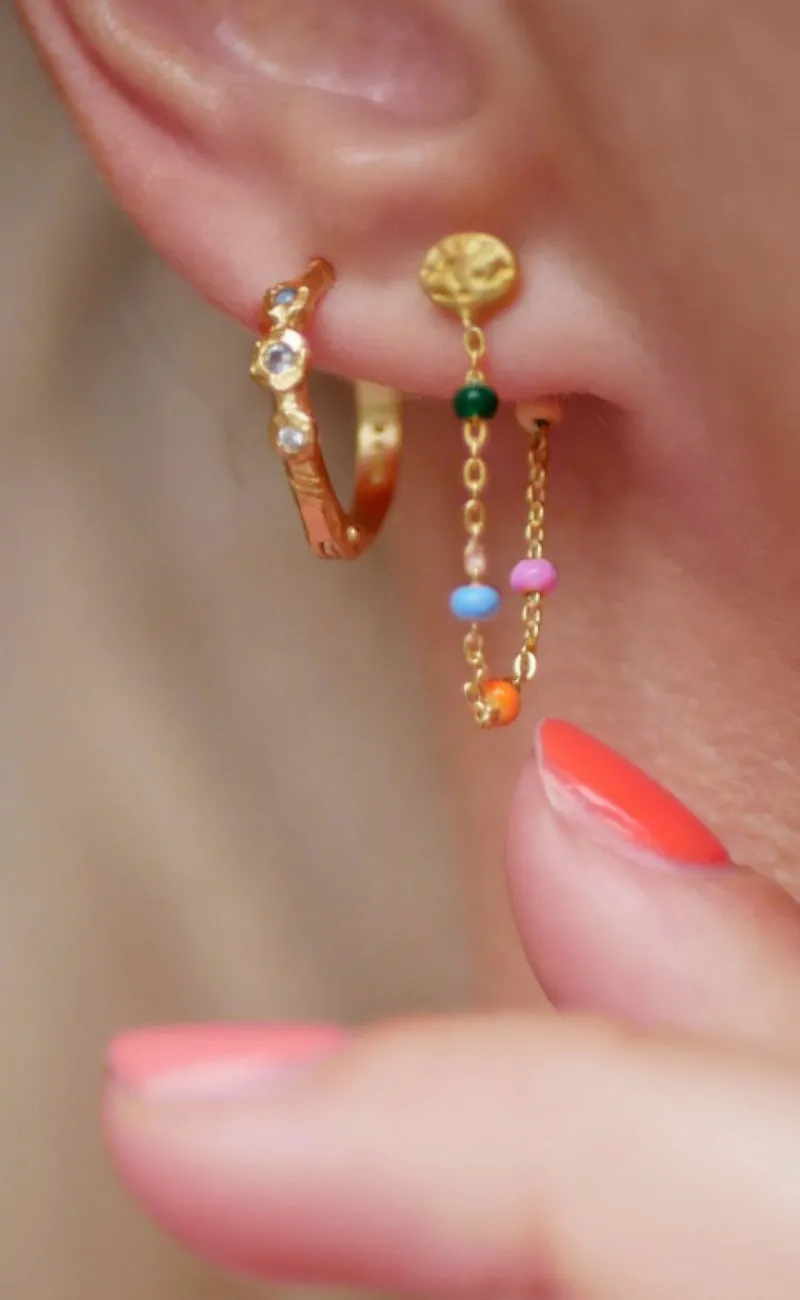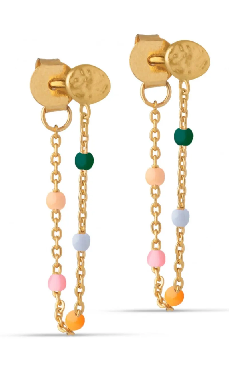 ENAMEL Copenhagen øreringe i guld med en kæde, hvorpå der er emaljer i forskellige farver.