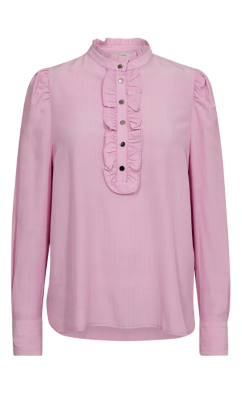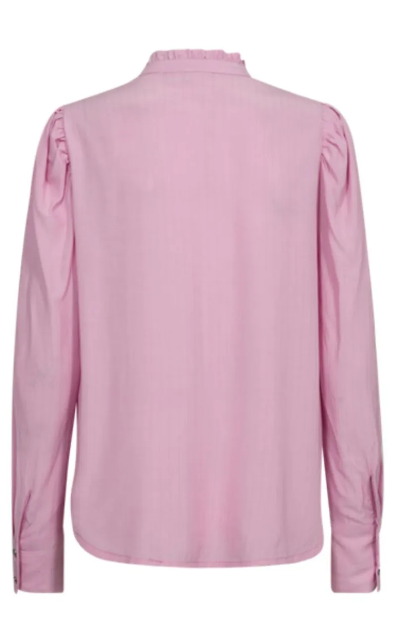 Skjorten har lange ærmer med let puf ved skulderen og en fin stolpeåbning med guld knapper og flæse-detaljer. Der er en fin runding ved bunden, så skjorten har en flot pasform.