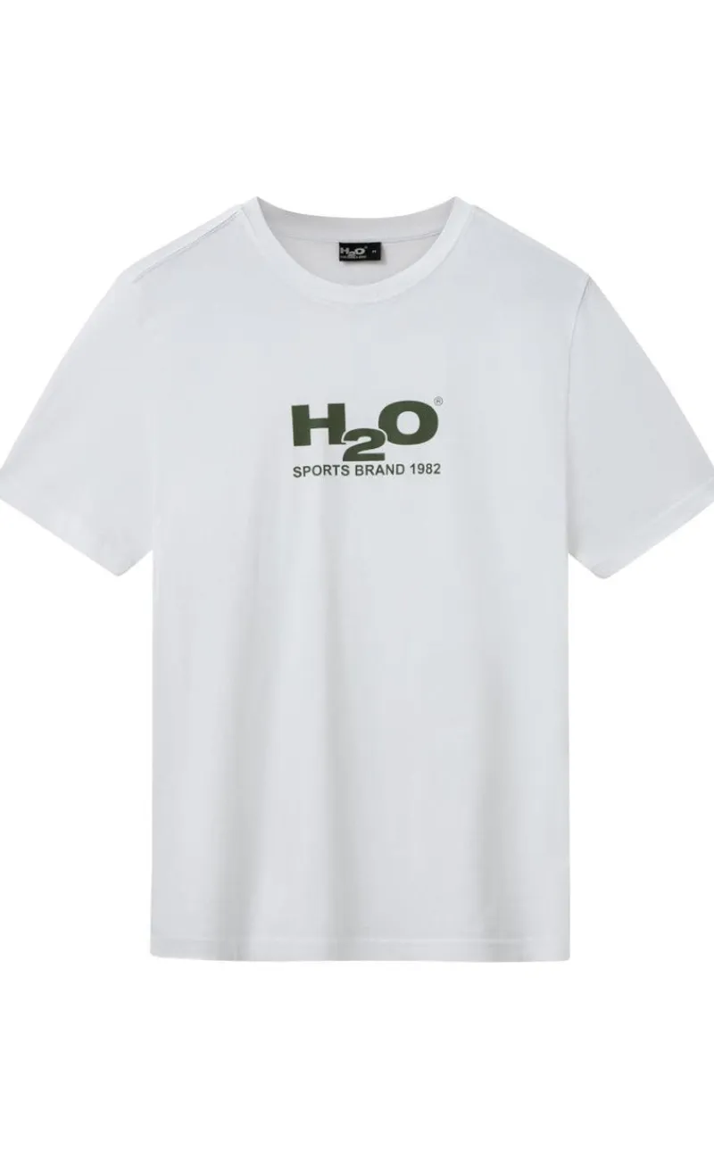 Flot og basic t-shirt fra H2O i hvid med det klassiske “H2O” logo fortil, i grøn.