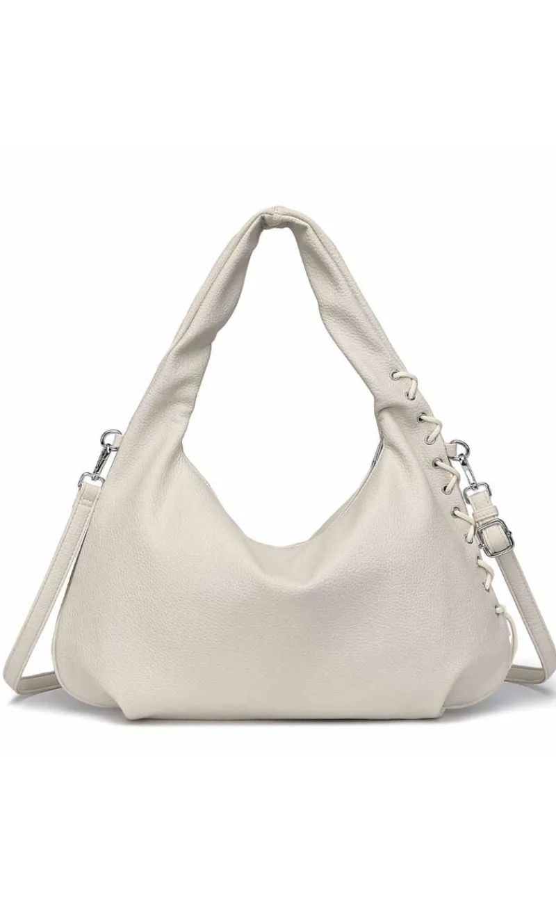 Tasken kan bæres over skulderen og har en fin detalje i siden.