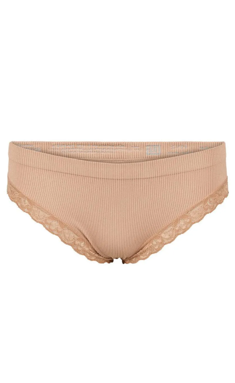 Søde trusser i nude fra Tim & Simonsen. Trusserne er lavet i et strækbart og ribbet materiale, så de er super behagelige at have på. De har fine blondedetaljer.