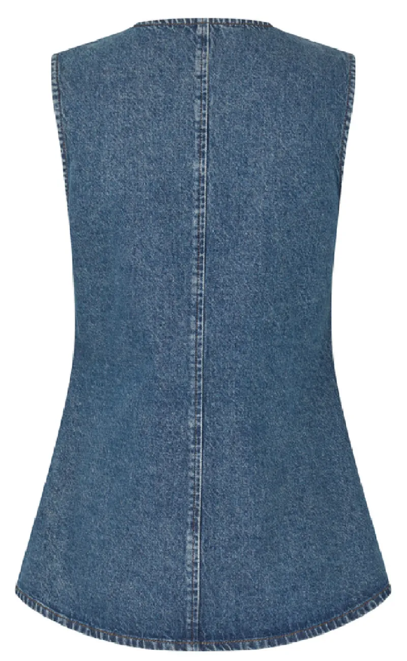 Blusen er ærmeløs, har en fremhævet talje og er gennemknappet.