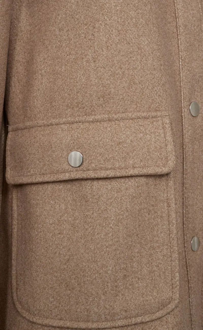 Denne jakke er i en beige farve. Har to store lommer, en krave og knapper.