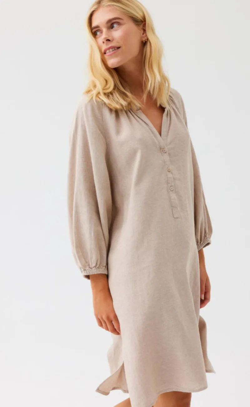 Kjolen har lange ærmer ærmer, en v-udskæring efterfulgt af en kort knaplukning. Desuden har den en løs pasform.