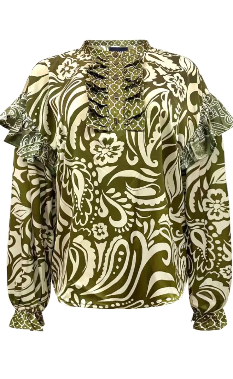 Denne bluse har de smukkeste detajler såsom flæsedetaljer og en løs pasform.