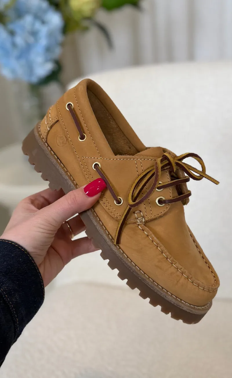 Moderne loafers fra Phenumb i en gul farve, med fede kontrast syninger.