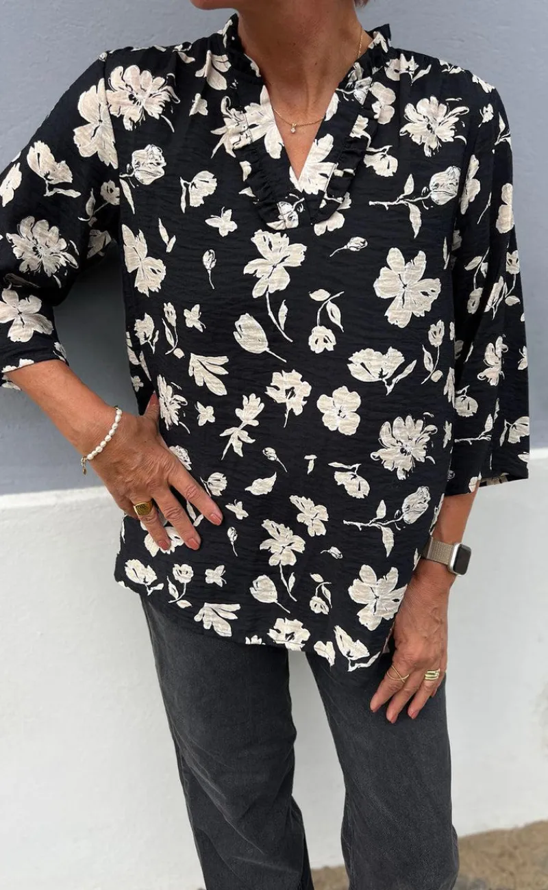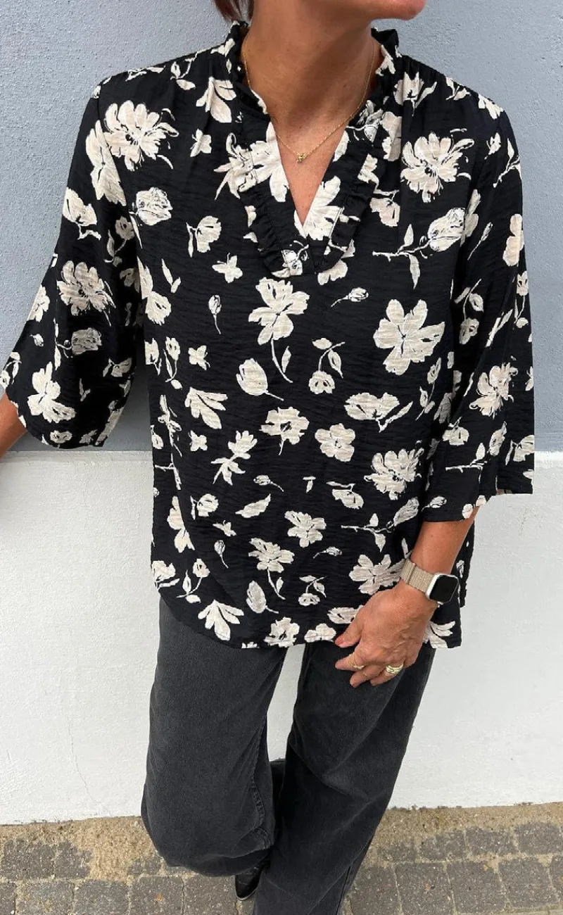 Fin bluse fra INA Copenhagen i sort med beige blomster.
