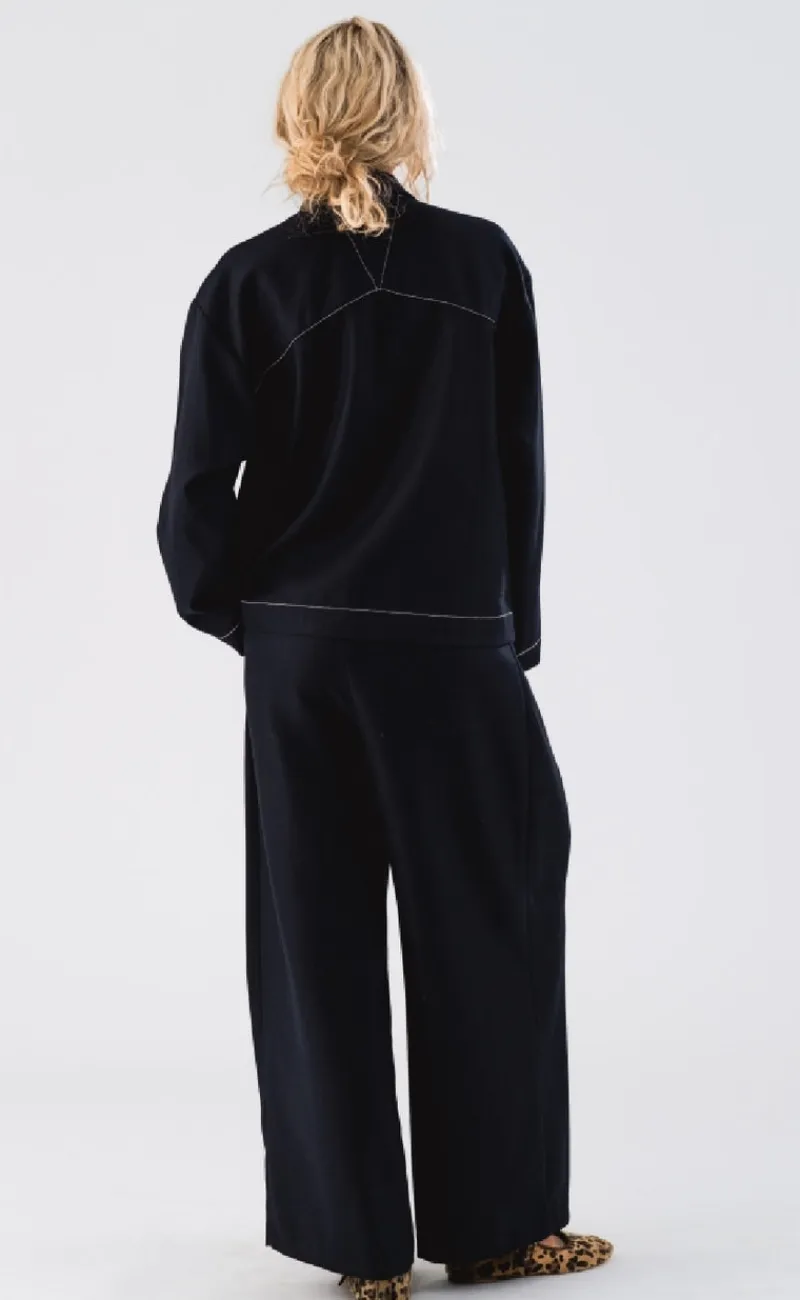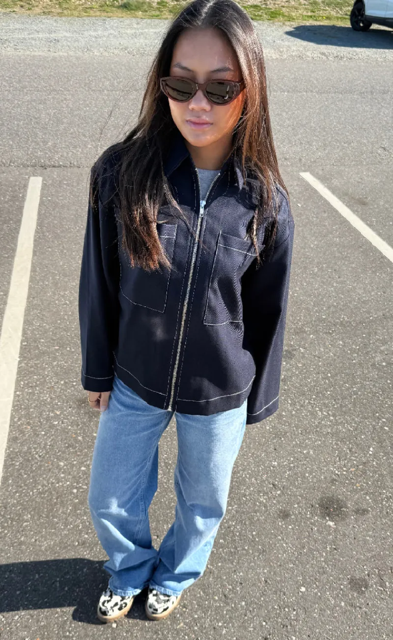 Flot jakke fra Lollys Laundry i mørkeblå, med hvide kontrast sygninger.