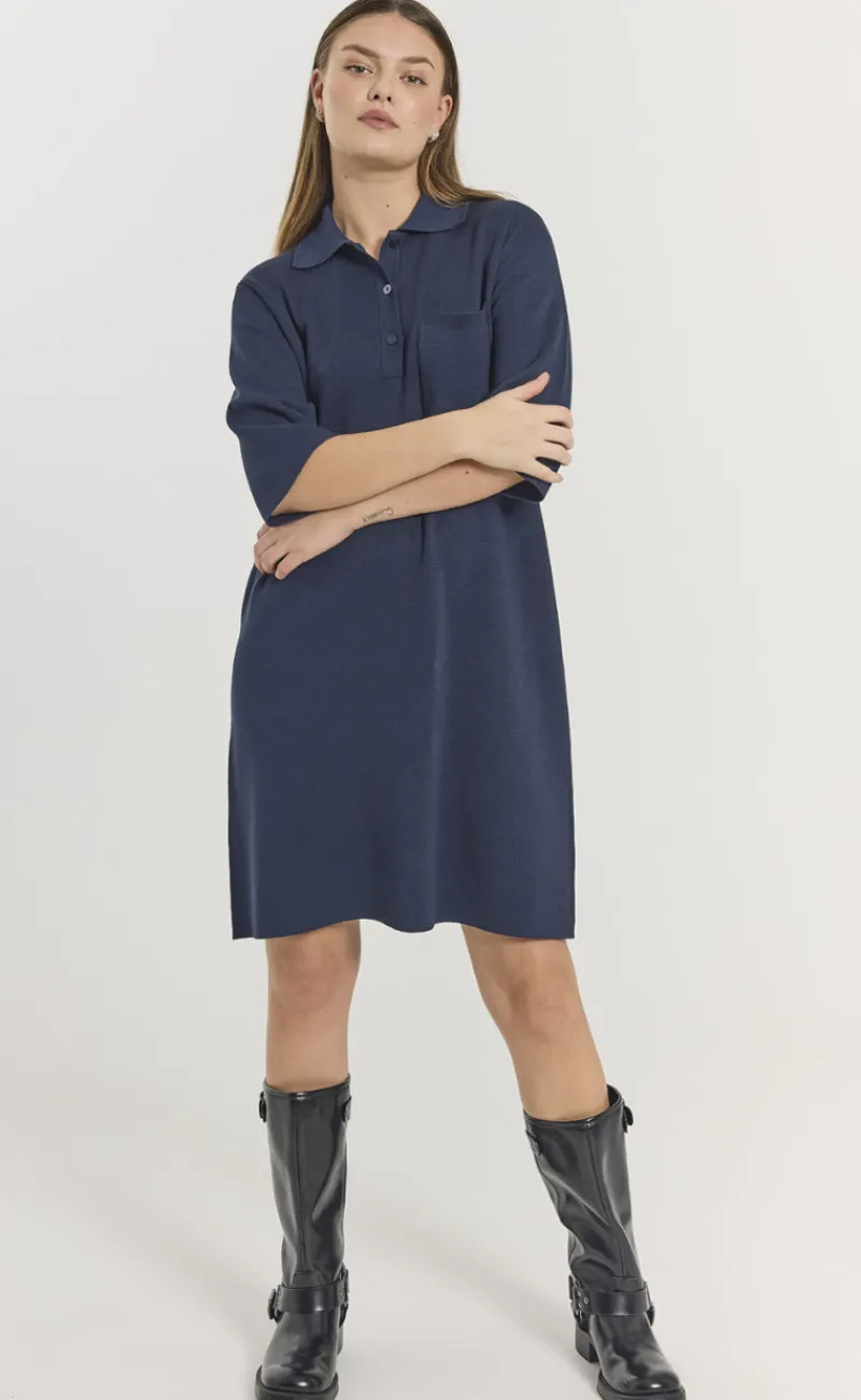 Kjolen er simpel med en krave og knapper foran.