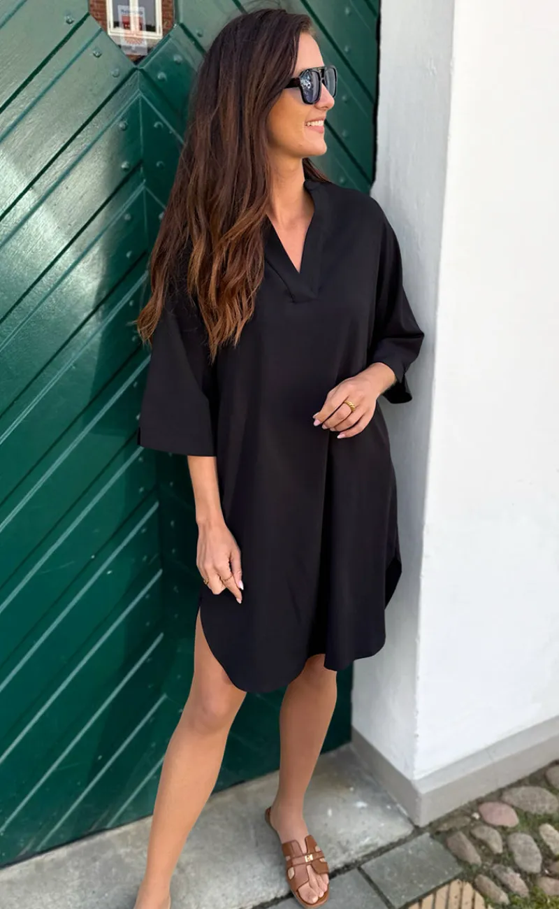 Kjolen har v-hals, lommer i siderne og 3/4 ærmer med vidde et lille slids i enden.