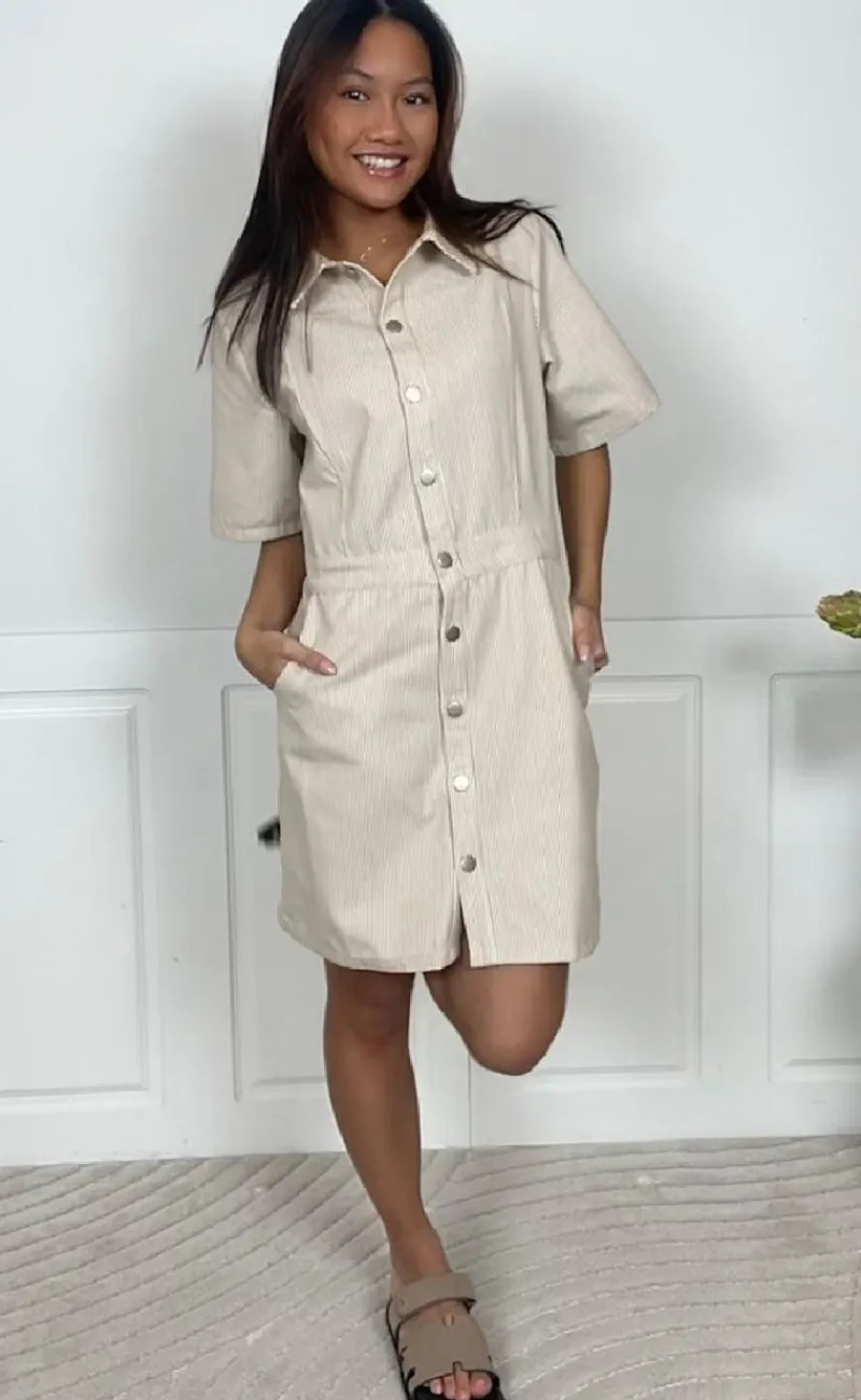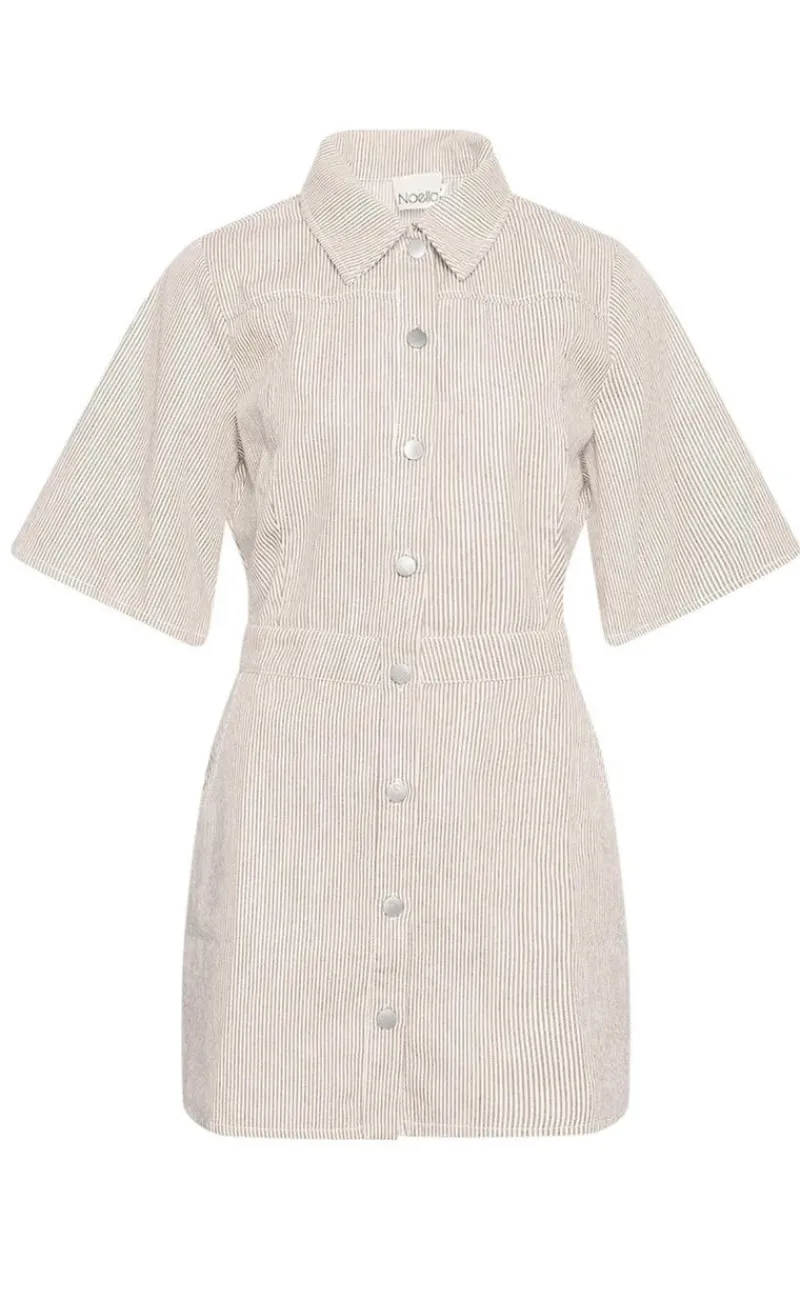 Smuk kjole fra Noella i beige med hvide nålestriber, i en denim kvalitet.