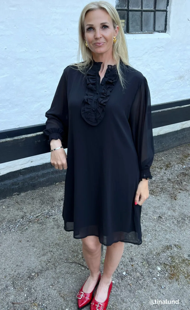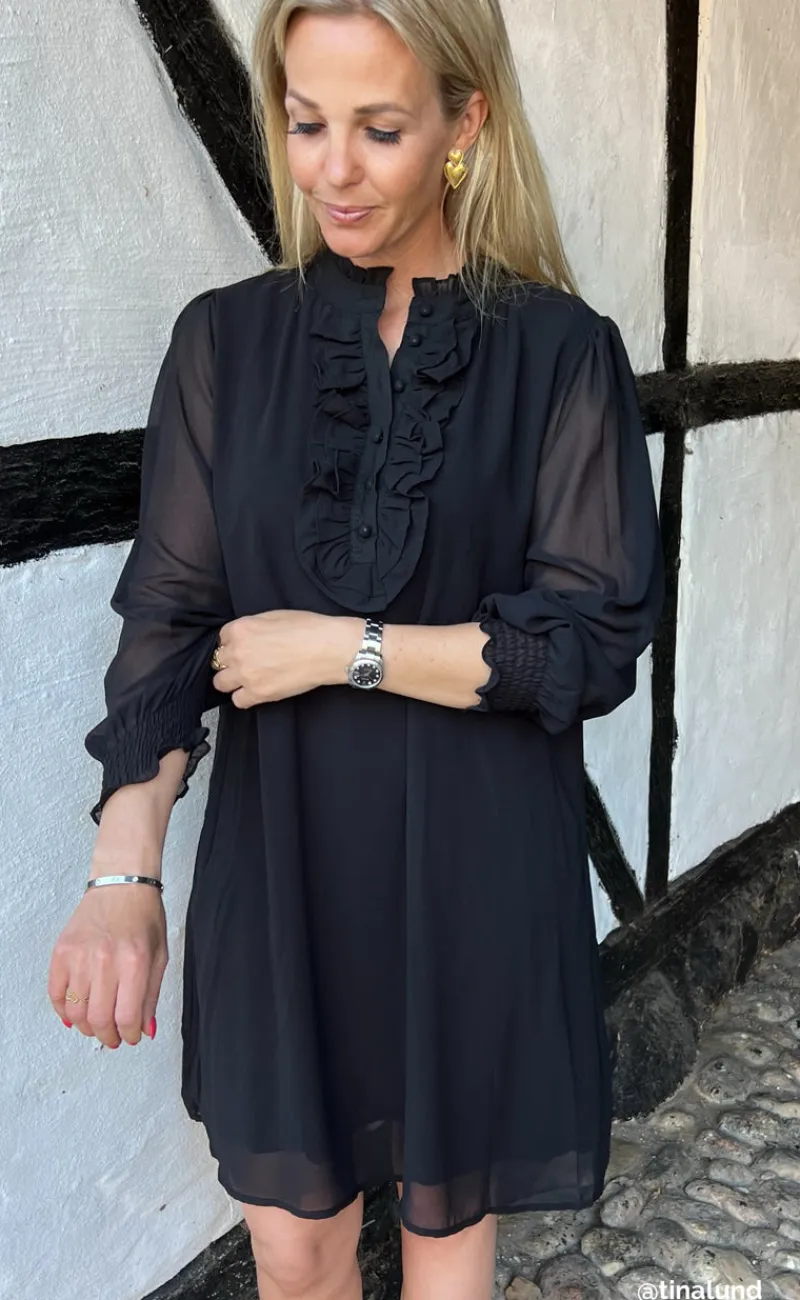 Smuk kjole fra INA Copenhagen i sort med de fineste flæser på fronten.