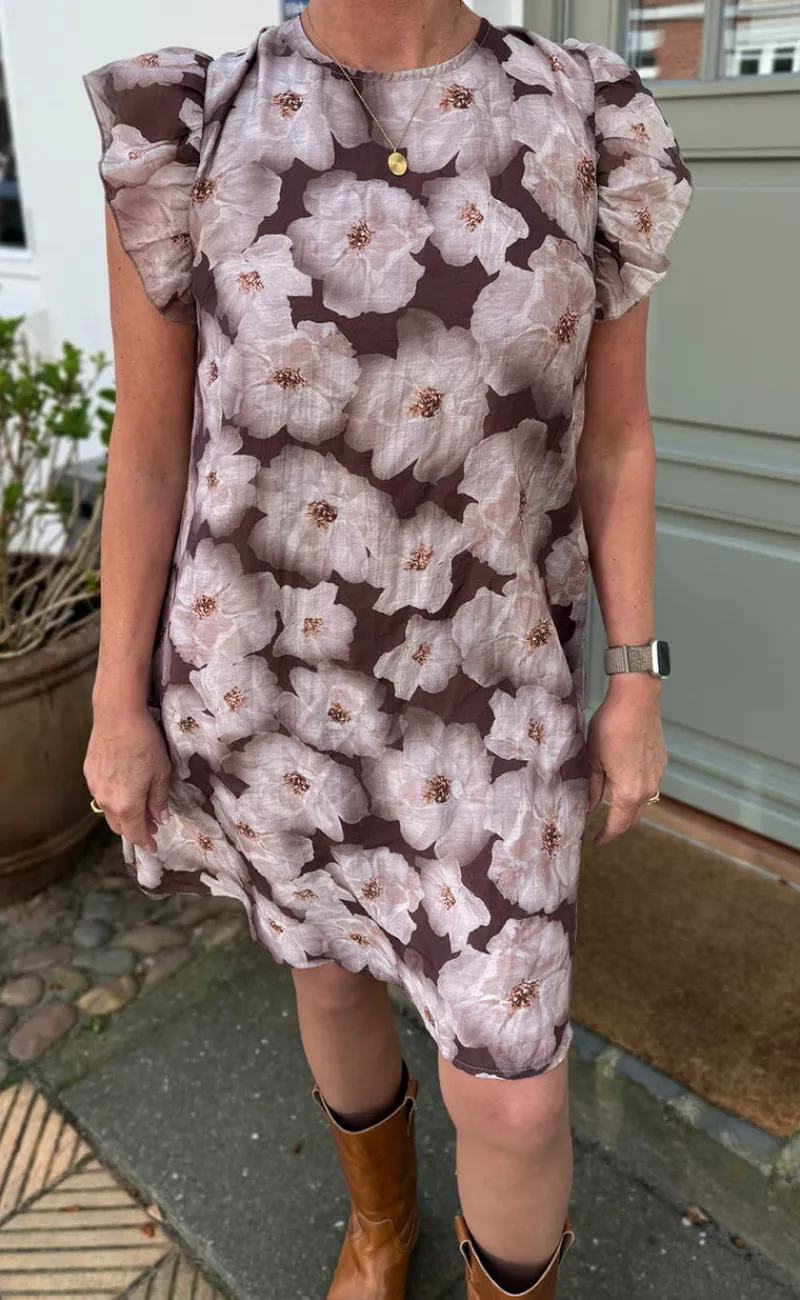Fin kjole fra INA Copenhagen med blomsterprint i brune nuancer.