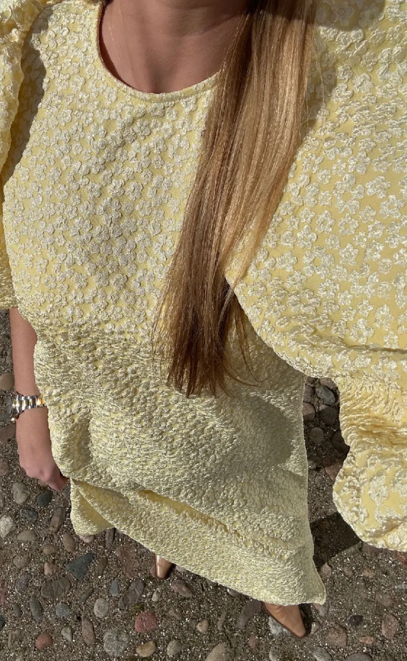 Elegant kjole fra Noella i gul med et diskret blomsterprint.