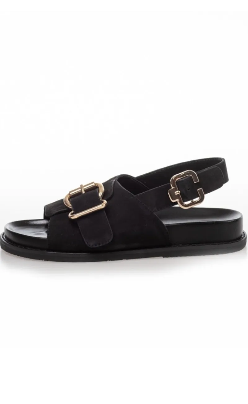Sandalerne er syet i ruskind og har en rem over foden som kan tilpasset.