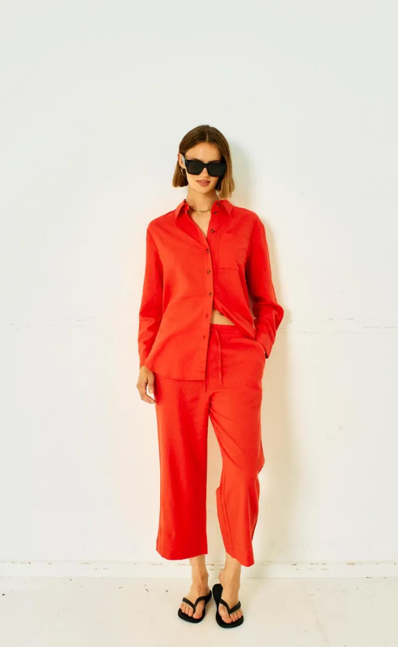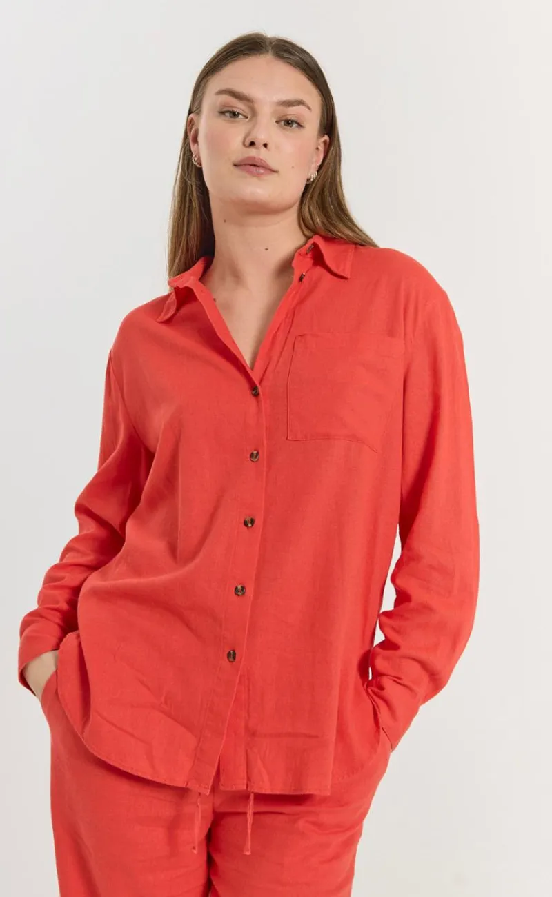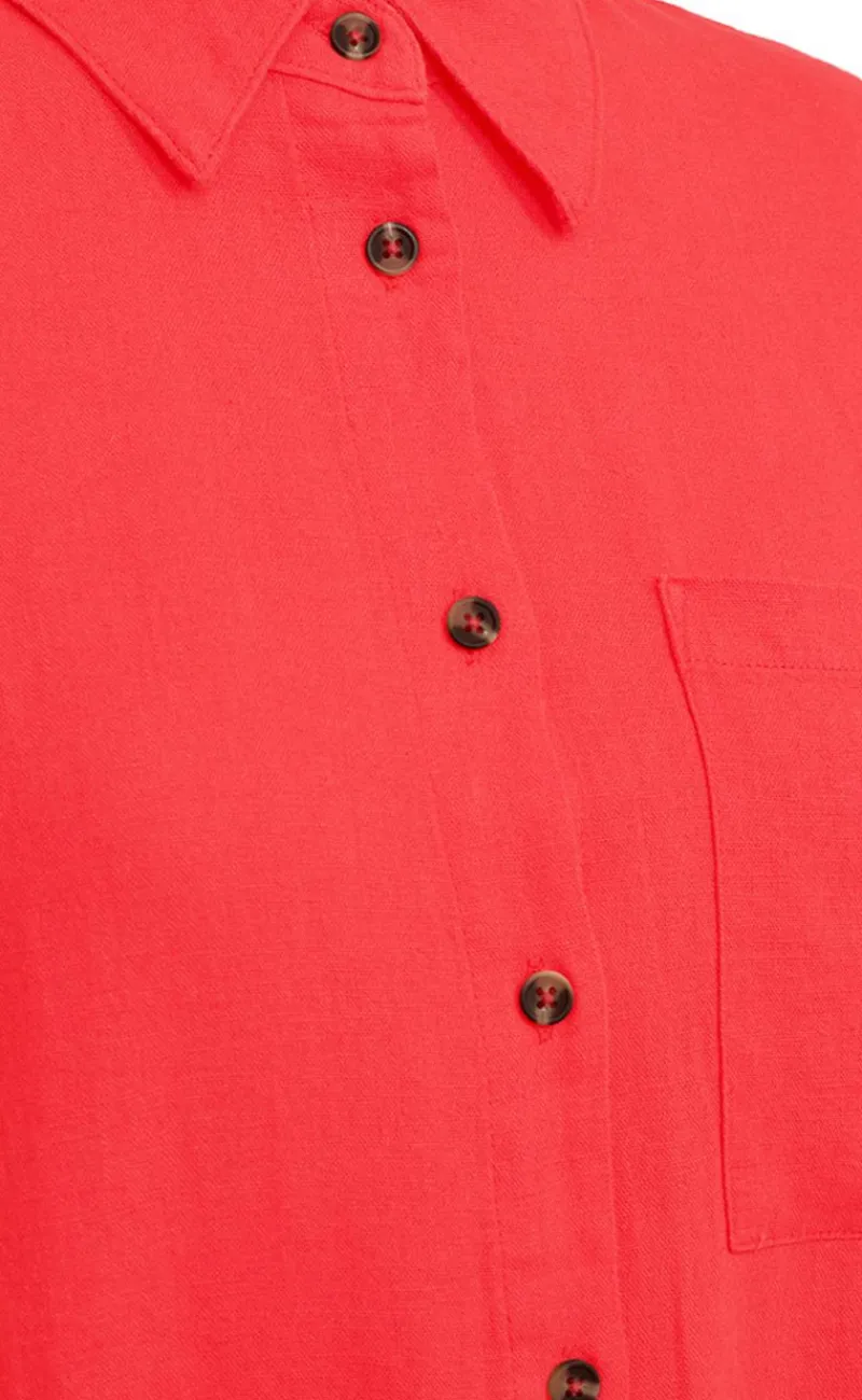 Skjorten har lange ærmer, er gennemknappet, en klassisk skjortekrave samt én brystlomme.