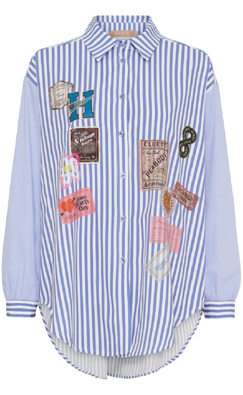 Flot skjorte fra Marta Du Chateau i et blå stribet print, med fine motiver rundt på skjorten.