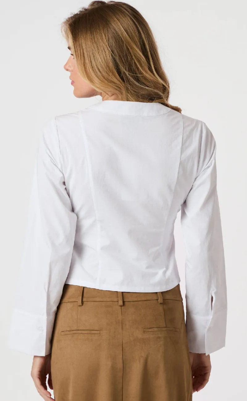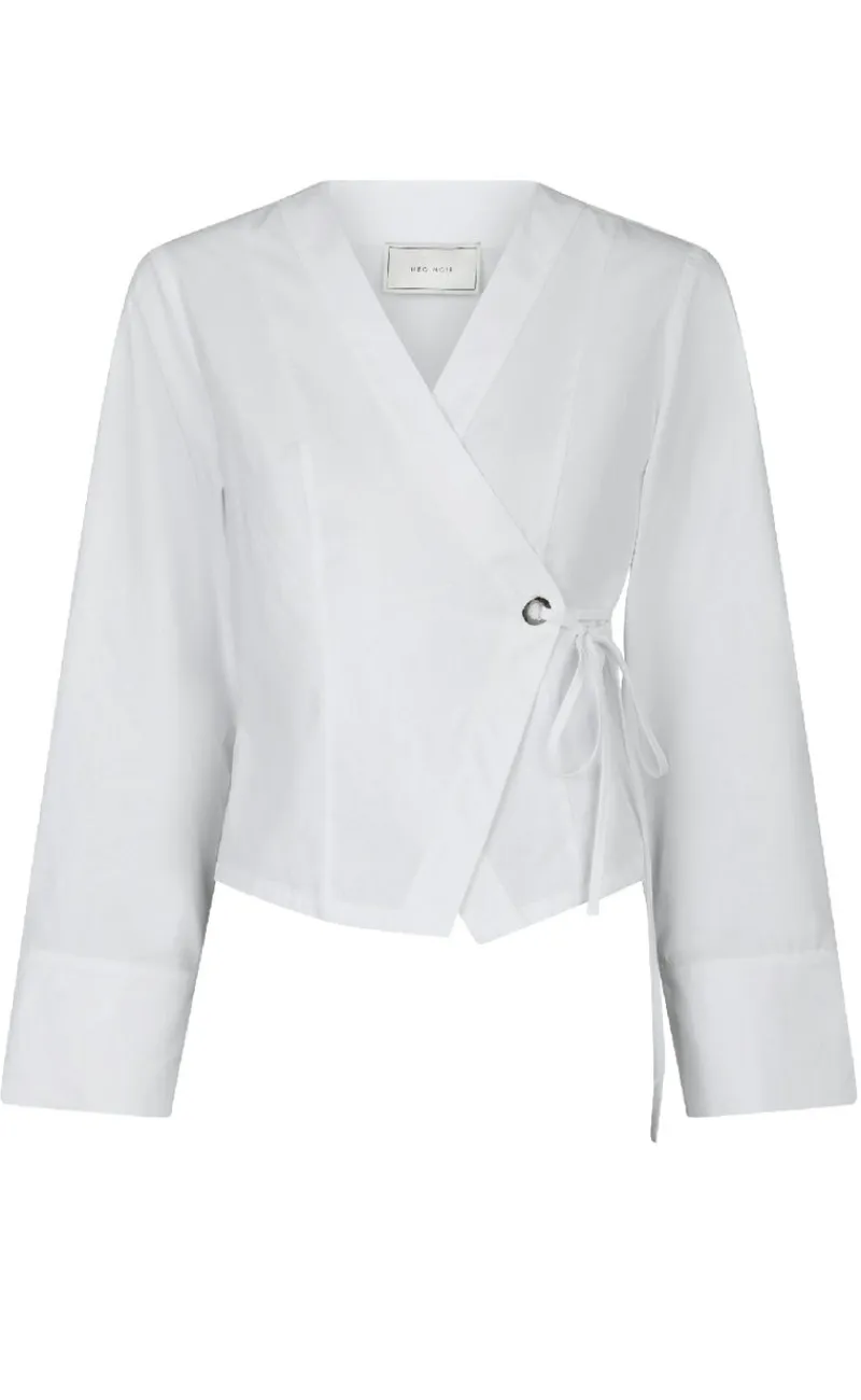 Skjorten har lange ærmer og bindsbåndsdetalje i siden.