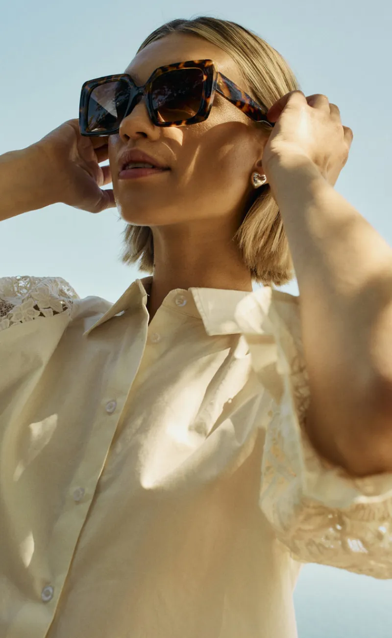 Skjorten har blonder på ærmerne og en fin krave.