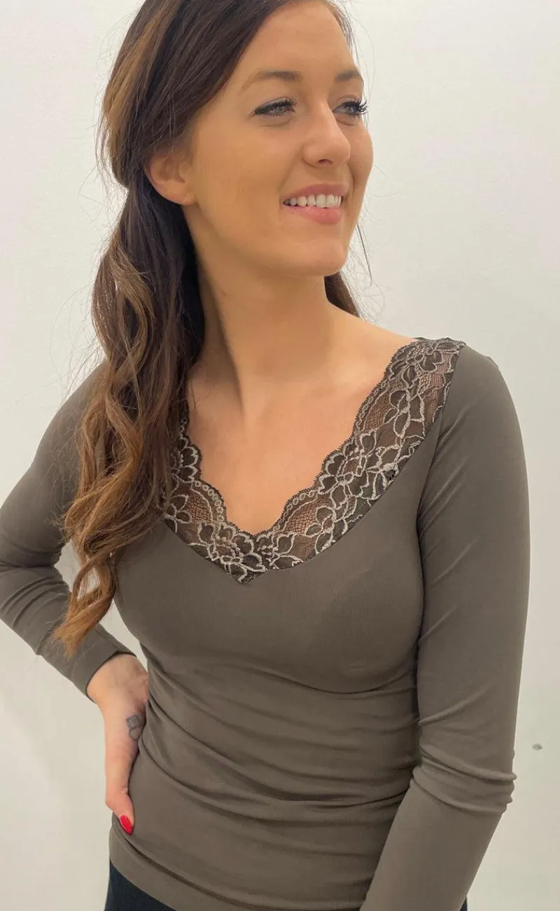 Basic langærmet bluse fra Tim & Simonsen, som har blonder ved halsudskæringen.