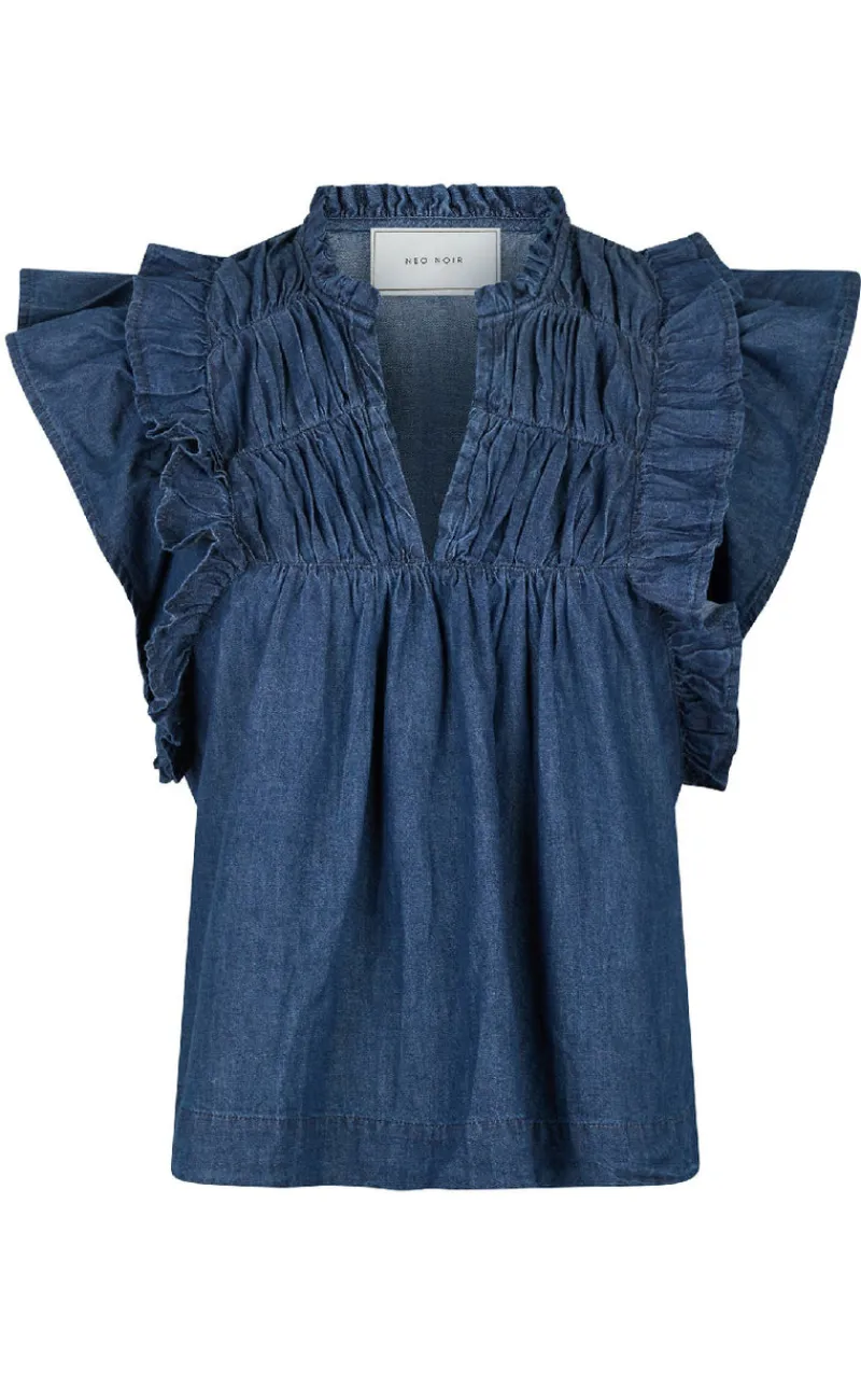 Smuk og populær top fra Neo Noir i blå i en denim kvalitet, med flæser og indsatte bånd.