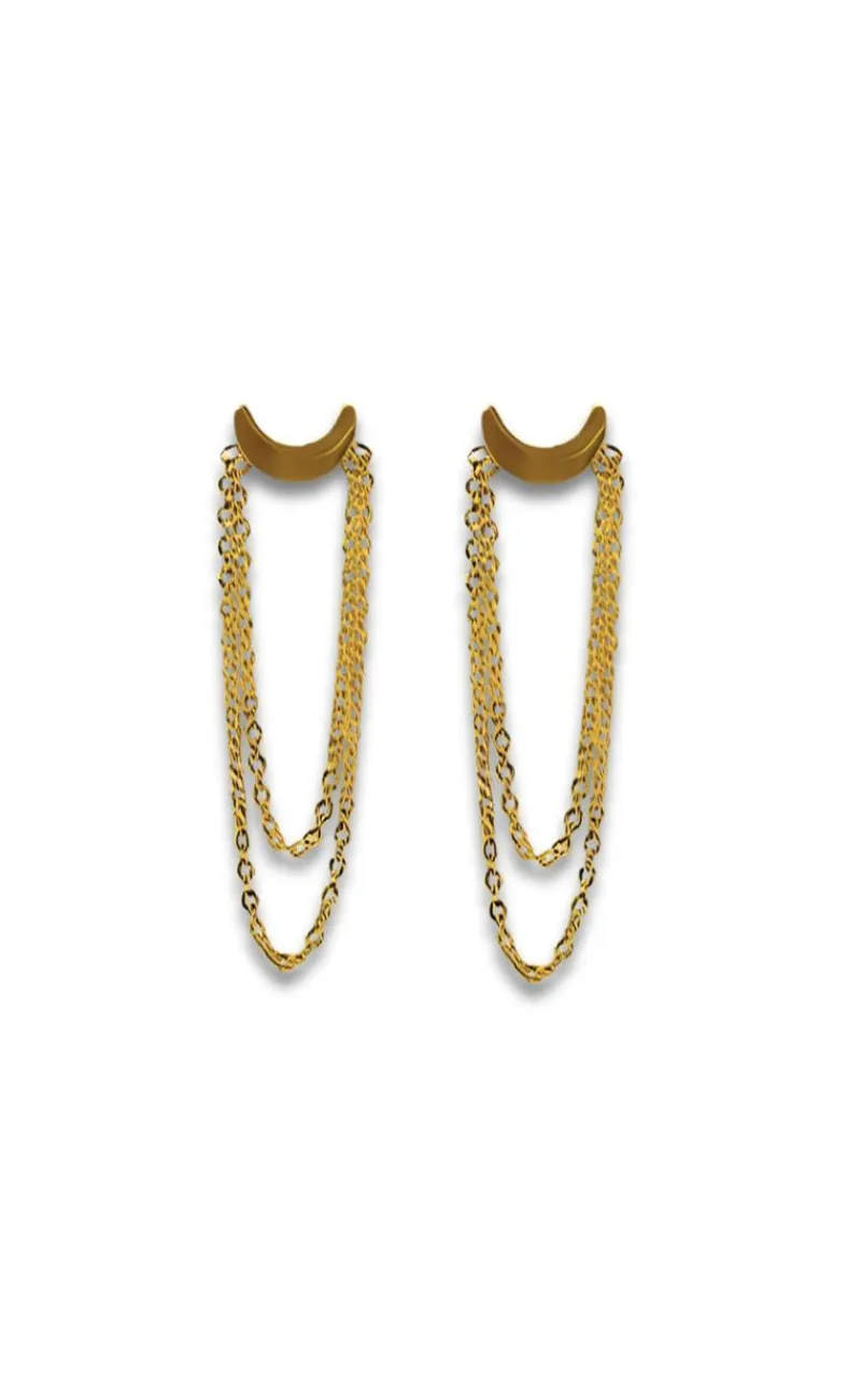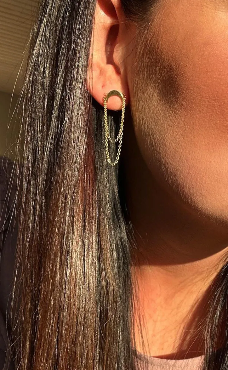 Populære øreringe fra Smykkeli Copenhagen i guld med form som en måne og to kæder ved låsen.