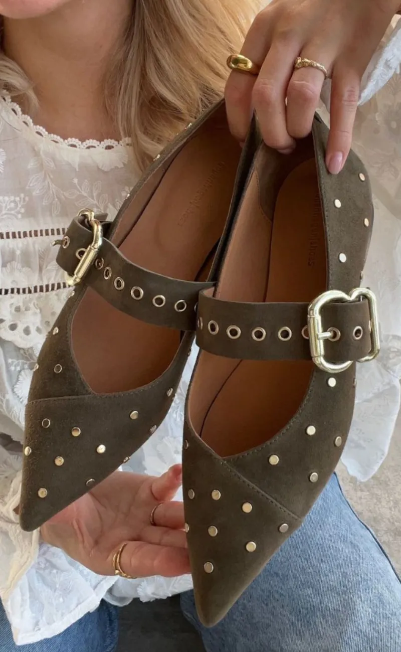 Flotte ballerinaer fra Coepnhagen Shoes i army grøn, med mange fine detaljer.