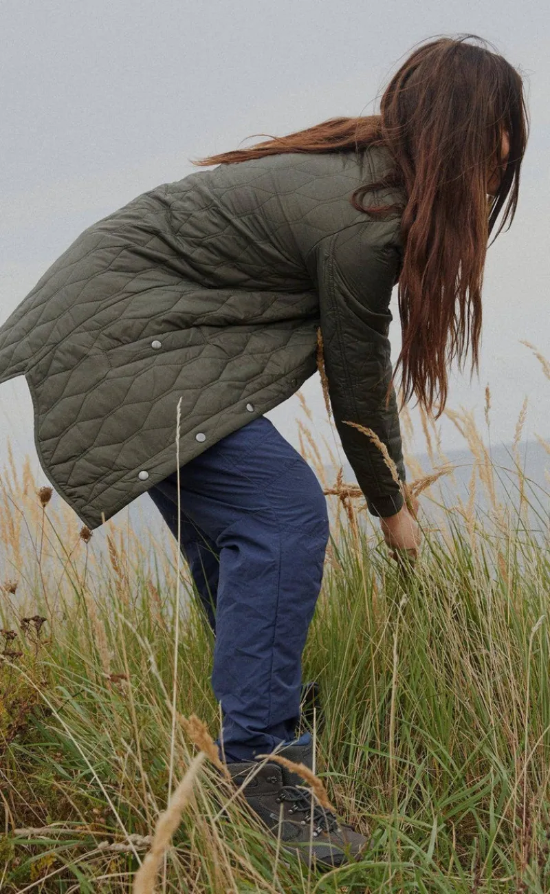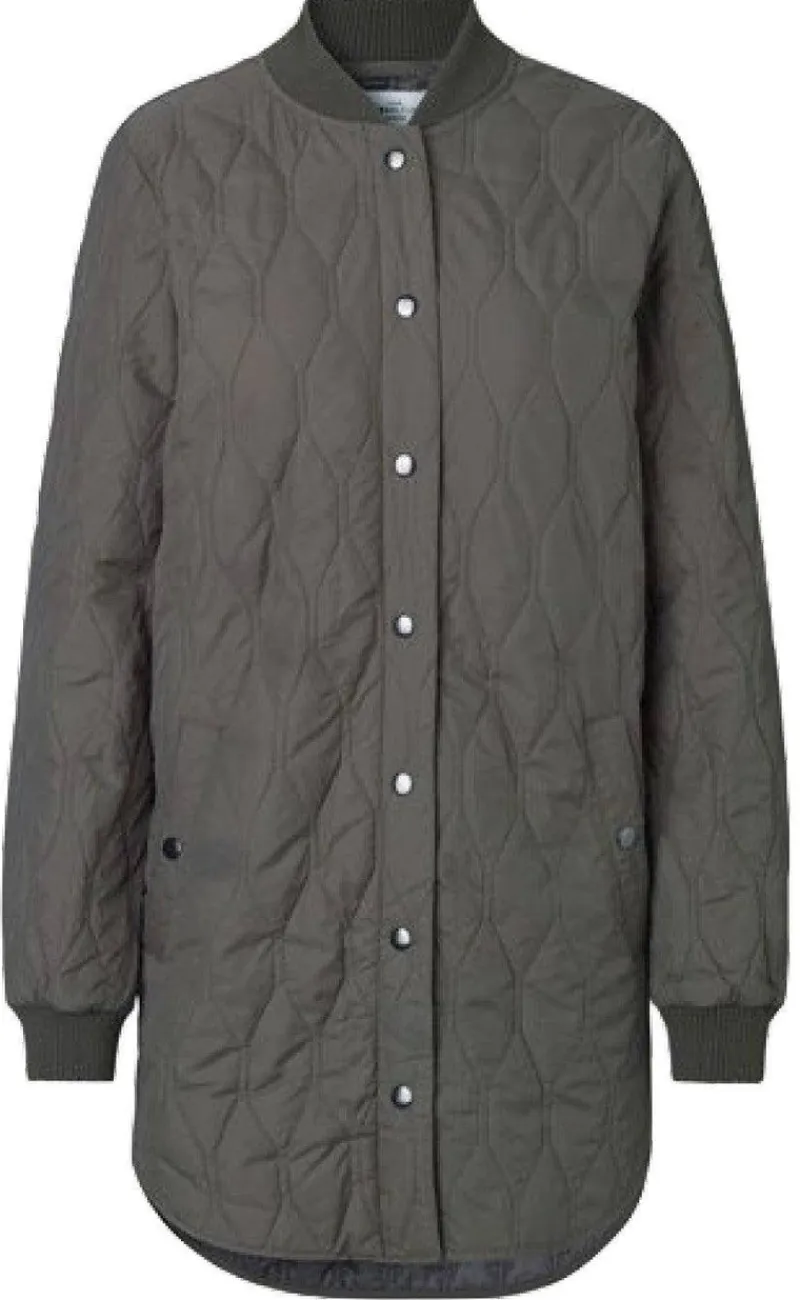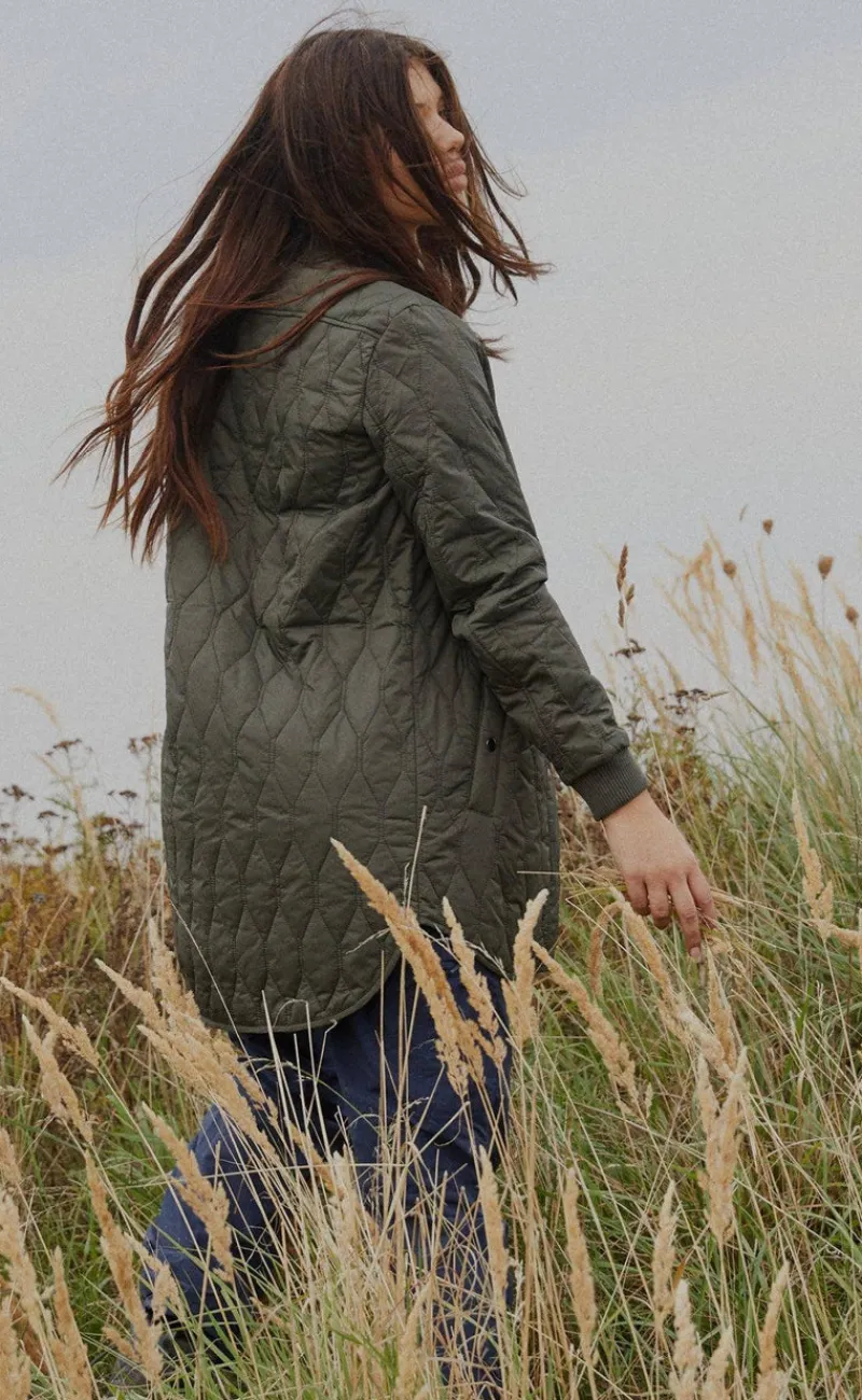 Quiltet jakke fra Global Funk i army med ribkanter ved ærmer og hals. Jakken lukkes med trykknapper og har lommer med knaplukning. Den er længere bagtil end fortil.