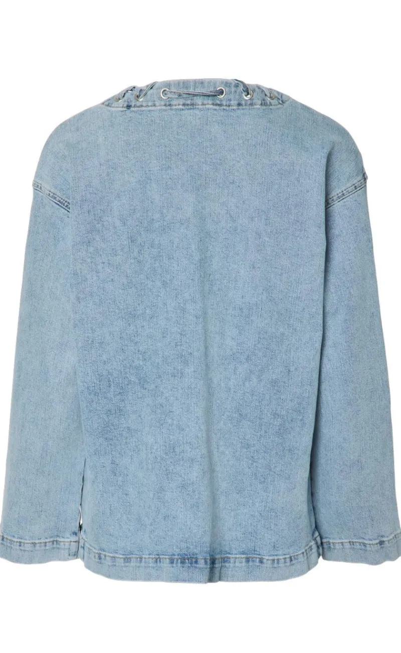 Fin denim jakke fra Pieces i lyseblå. Jakken er åbenstående.