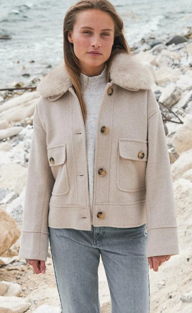 Denne uld jakke fra Neo Noir kommer i en sandfarve. Den har en mellem kort længde, pels-look krave og lykkes med knapper.