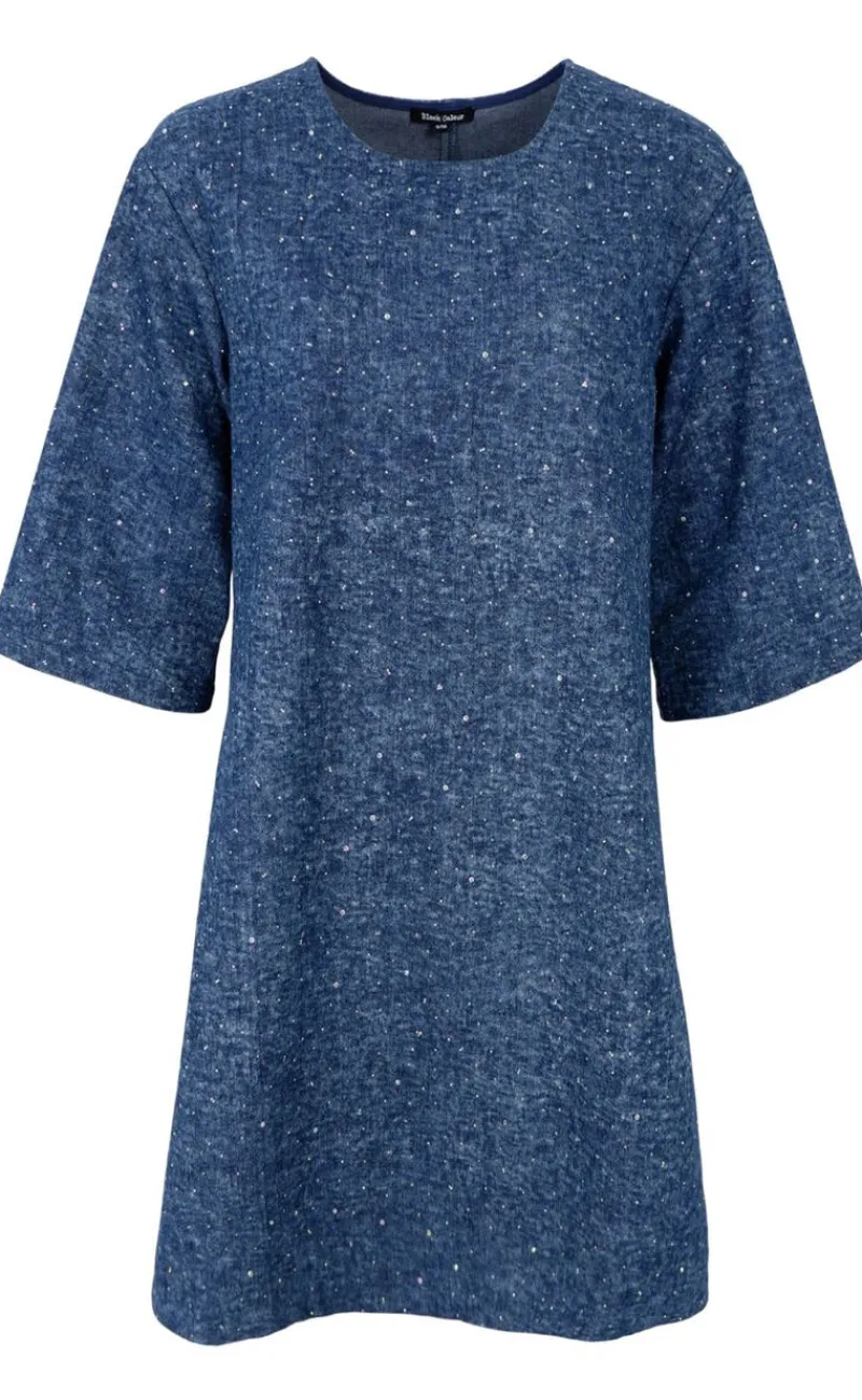 Smuk denim kjole fra Black Colour. Denne kjole går til knæet, og ikke mindst har de smukkeste sten der giver et festligt touch.