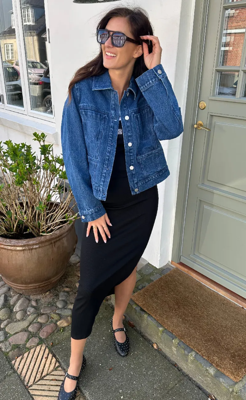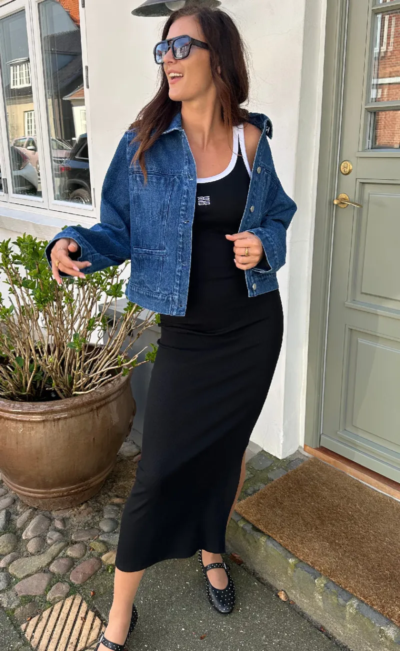 Tætsiddende maxi kjole fra Gestuz i sort med hvide kontrast sygninger, i en ribbet kvalitet.