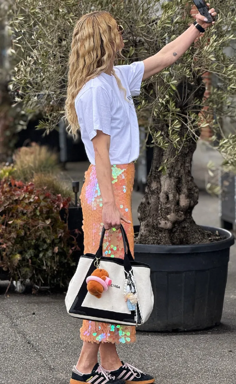 Festlig nederdel fra Moves beklædt med palietter i en coral farve.