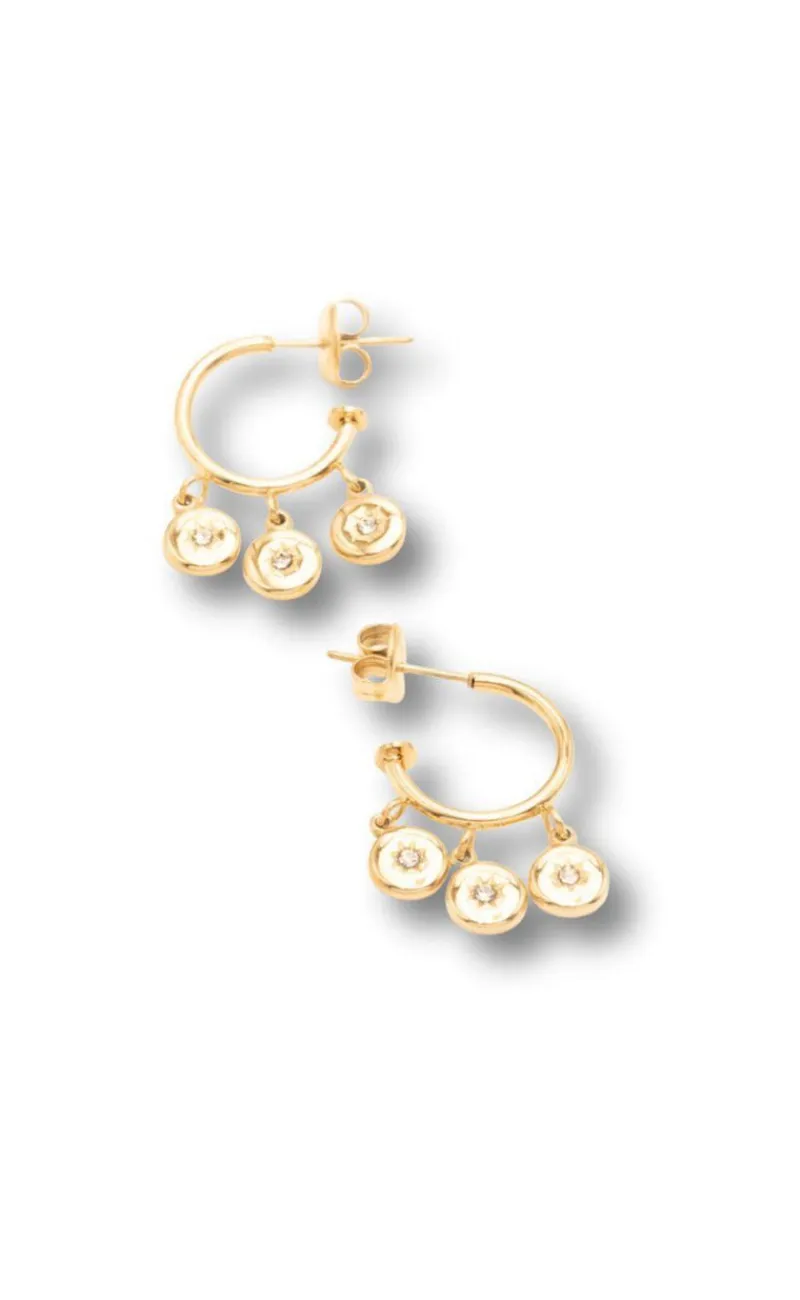 Smukke hoops fra Smykkeli Copenhagen i guld med 3 runde vedhæng med en indgraveret stjerne og en lille zirconia sten.