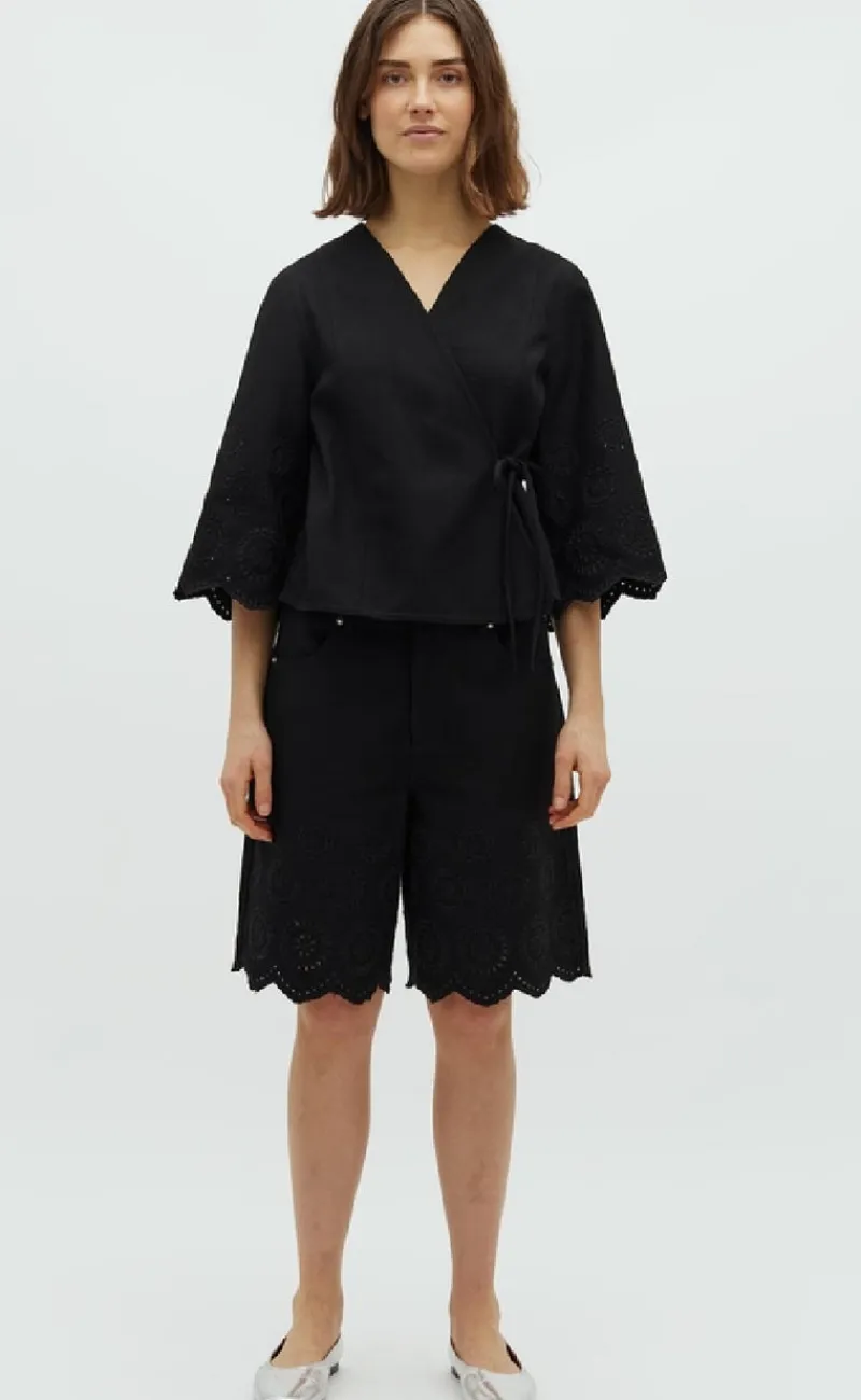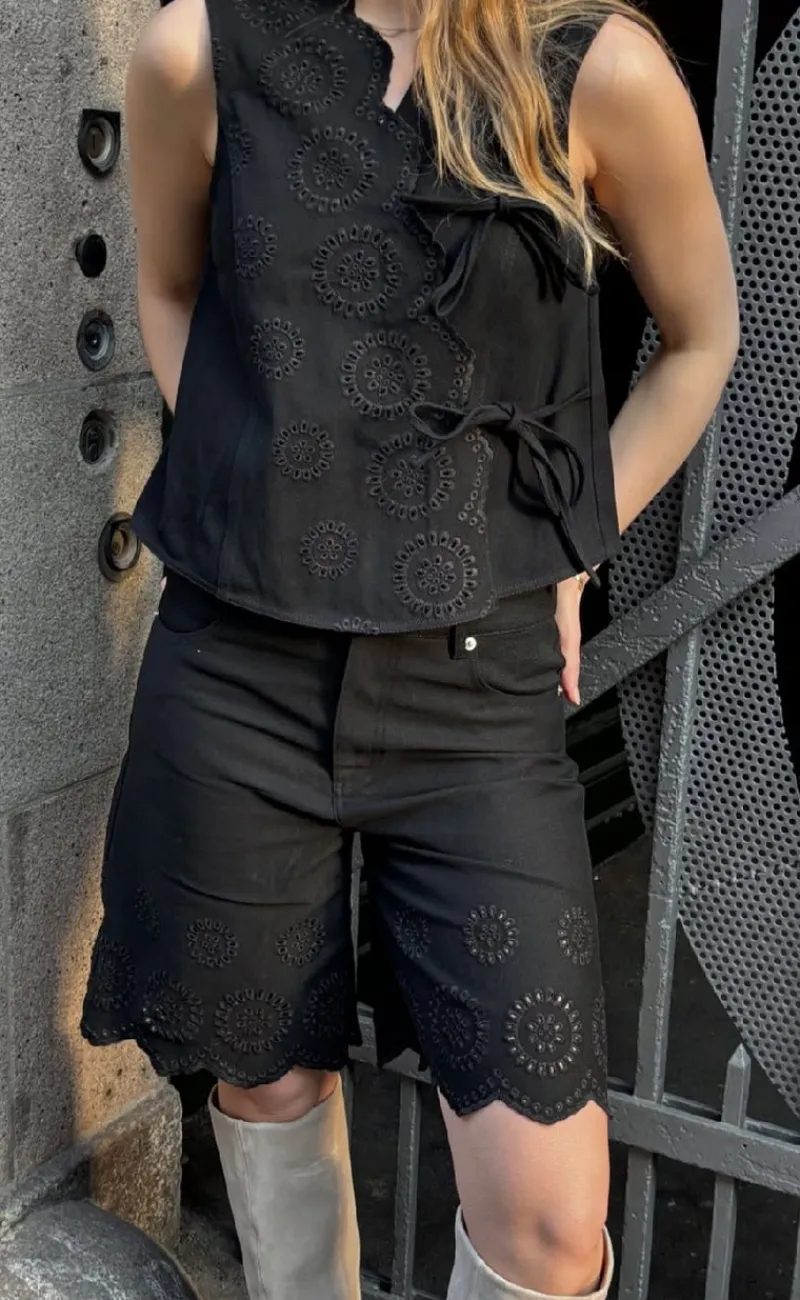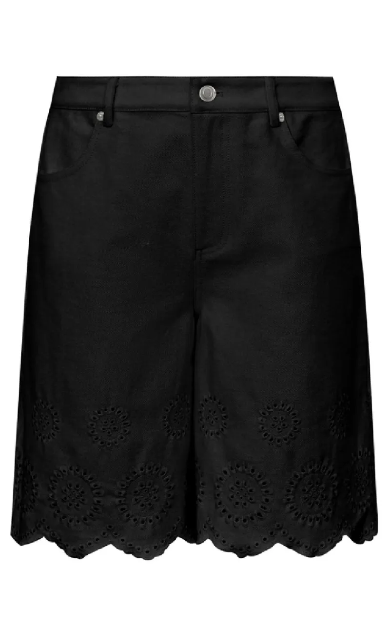Sorte denim shorts fra Global Funk med en broderi anglaise forneden.