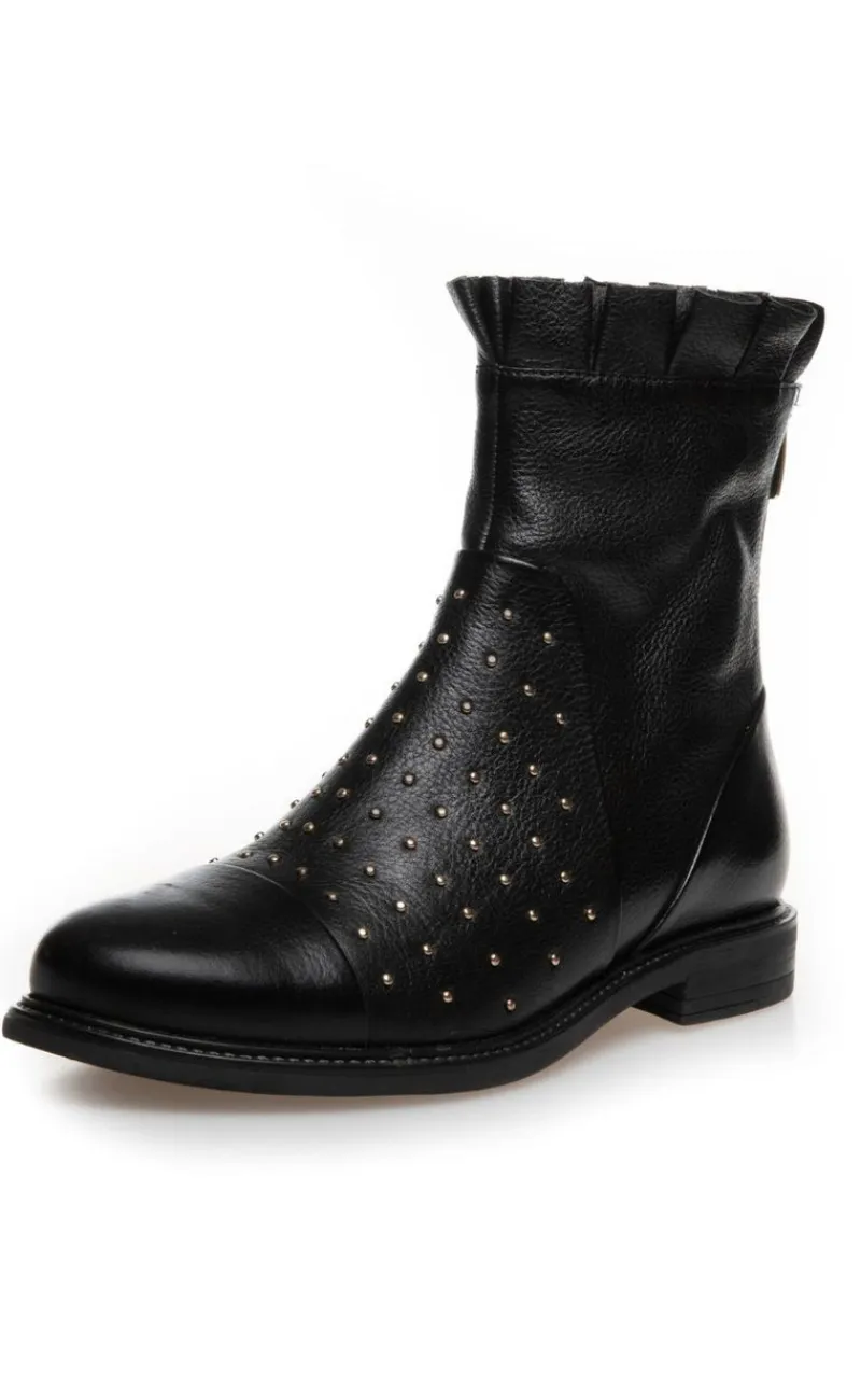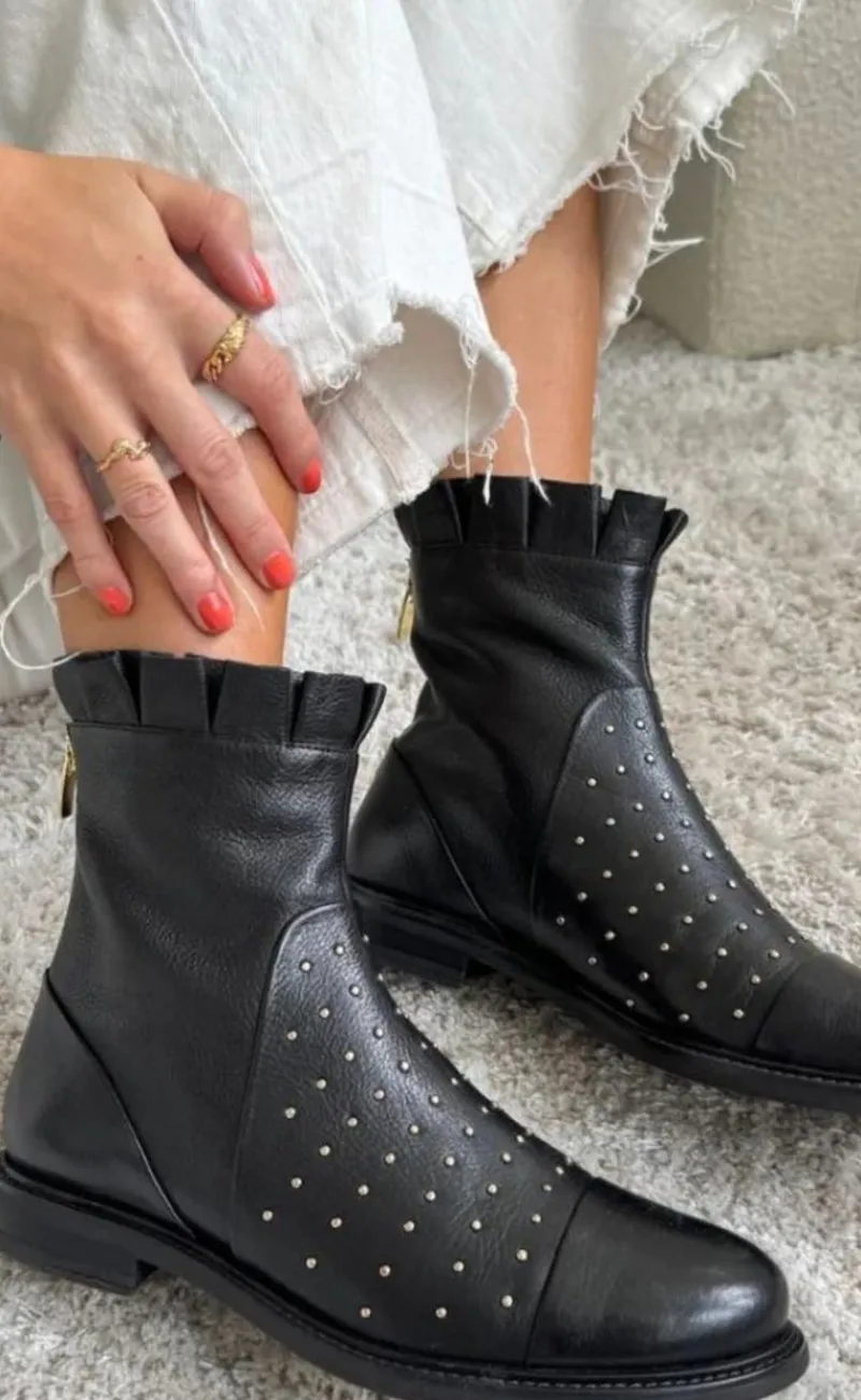 Støvlerne kommer i en skinnende farve, med sten rund på skoen samt flæse i toppen. De har en tynd sål og elastik i siderne, som gør dem nemmere at komme i.