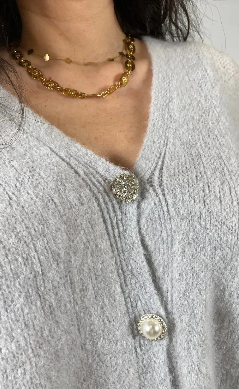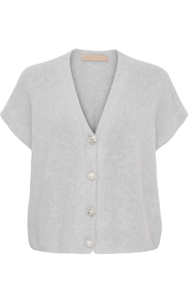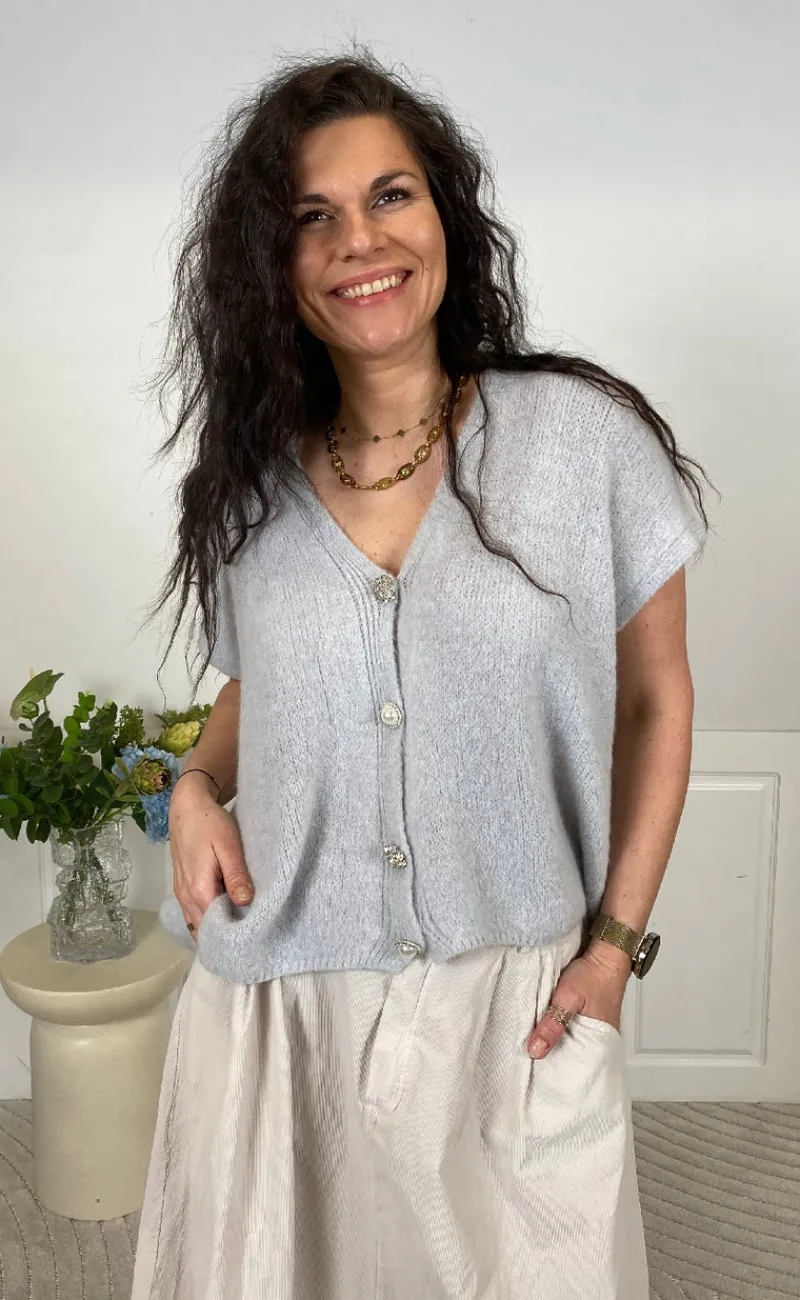 Lækker strik med en dyb udskæring, flotte knapper og korte ærmer.