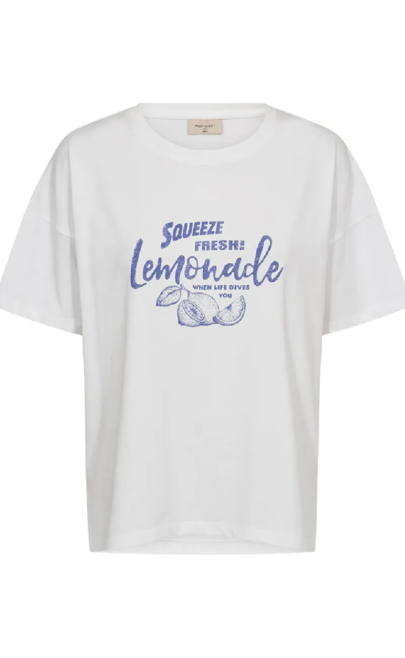 Flot og basic t-shirt fra Freequent i hvid, med et blåt print.