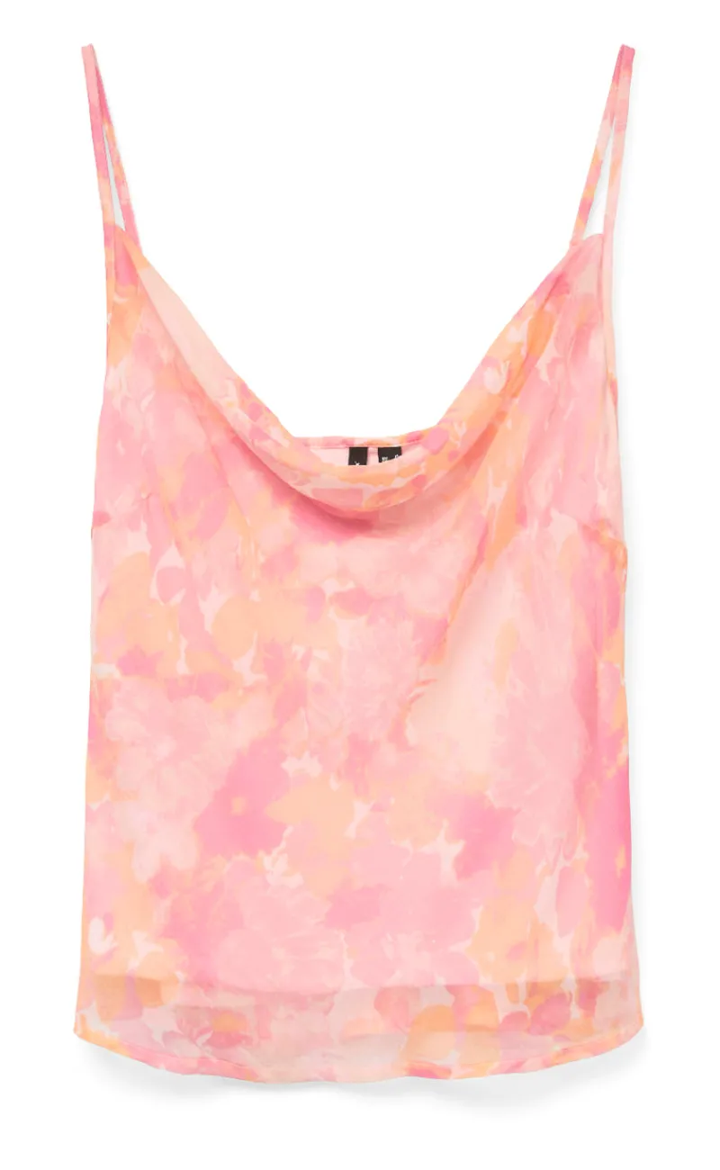 Sød top fra Vero Moda i et lyserødt print, med tynde stropper og vandfaldsudskæring.