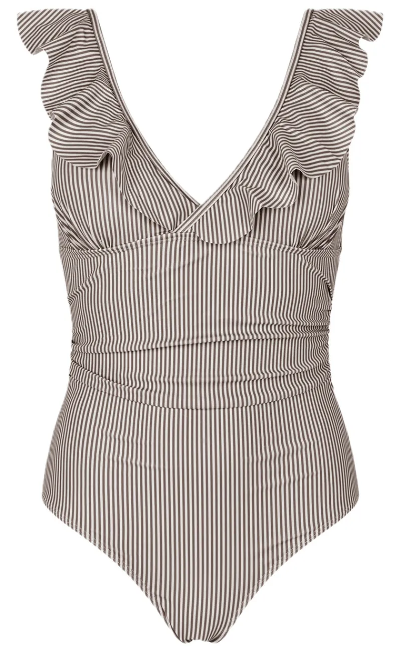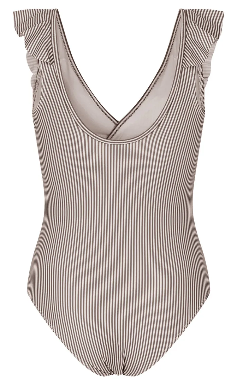 Brun/hvid stribet badedragt med de fineste flæse detaljer ved brystet og perfekt pasform