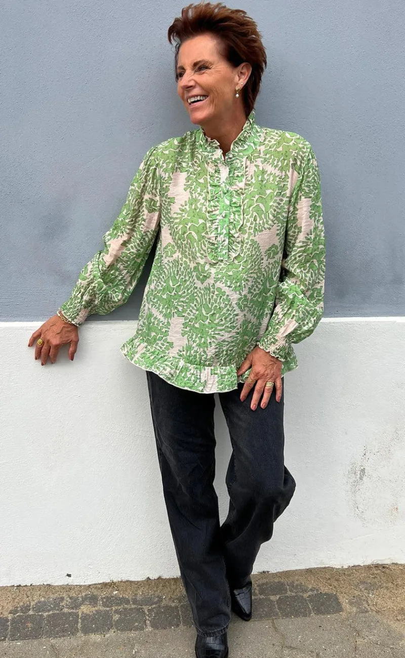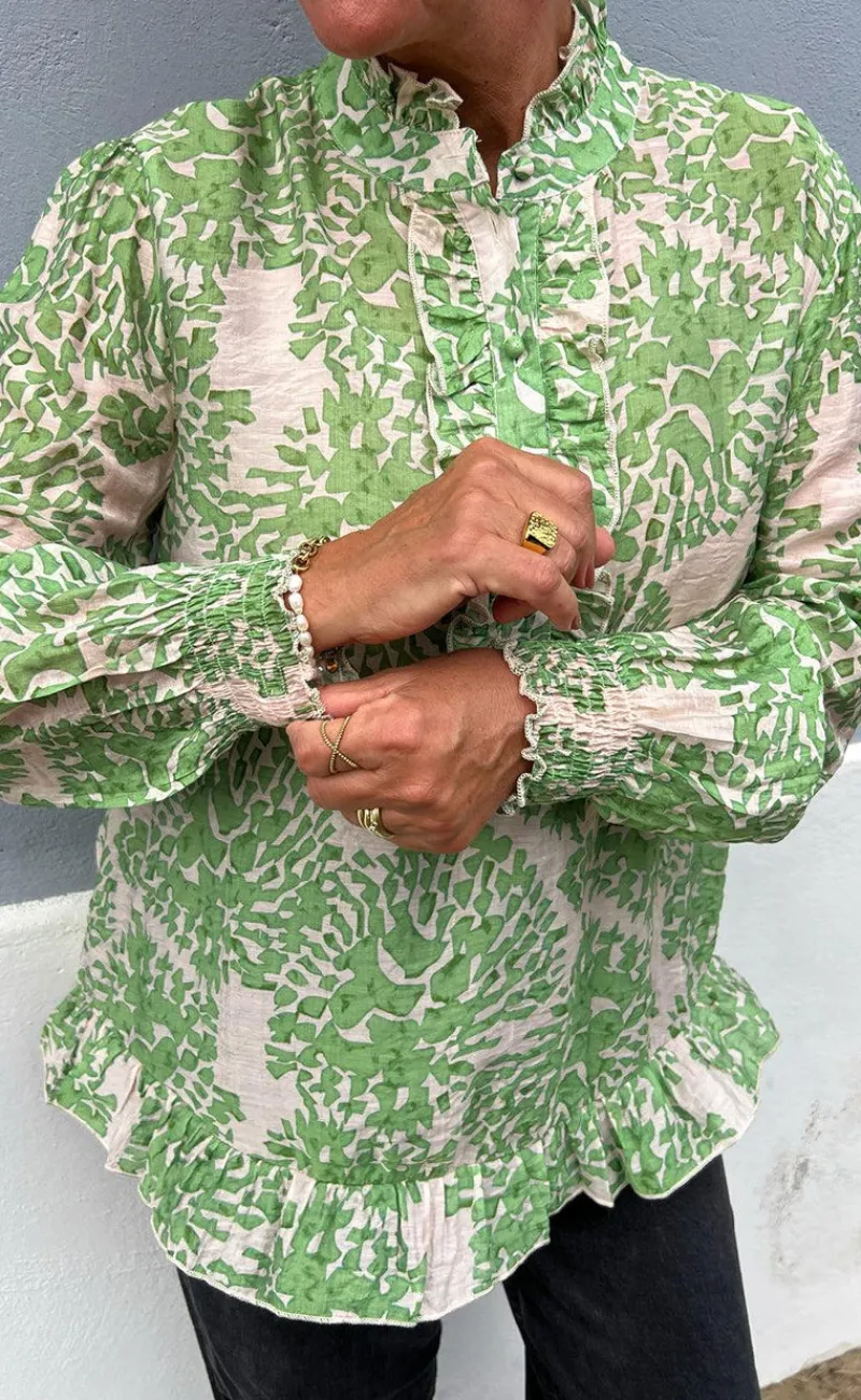 Blusen har den fineste åbning med knapper og flæser på fronten. Blusen har lange ærmer med smock i enden, så de kan trækkes op efter ønske. Der er en fin flæse-detalje i bunden af blusen.