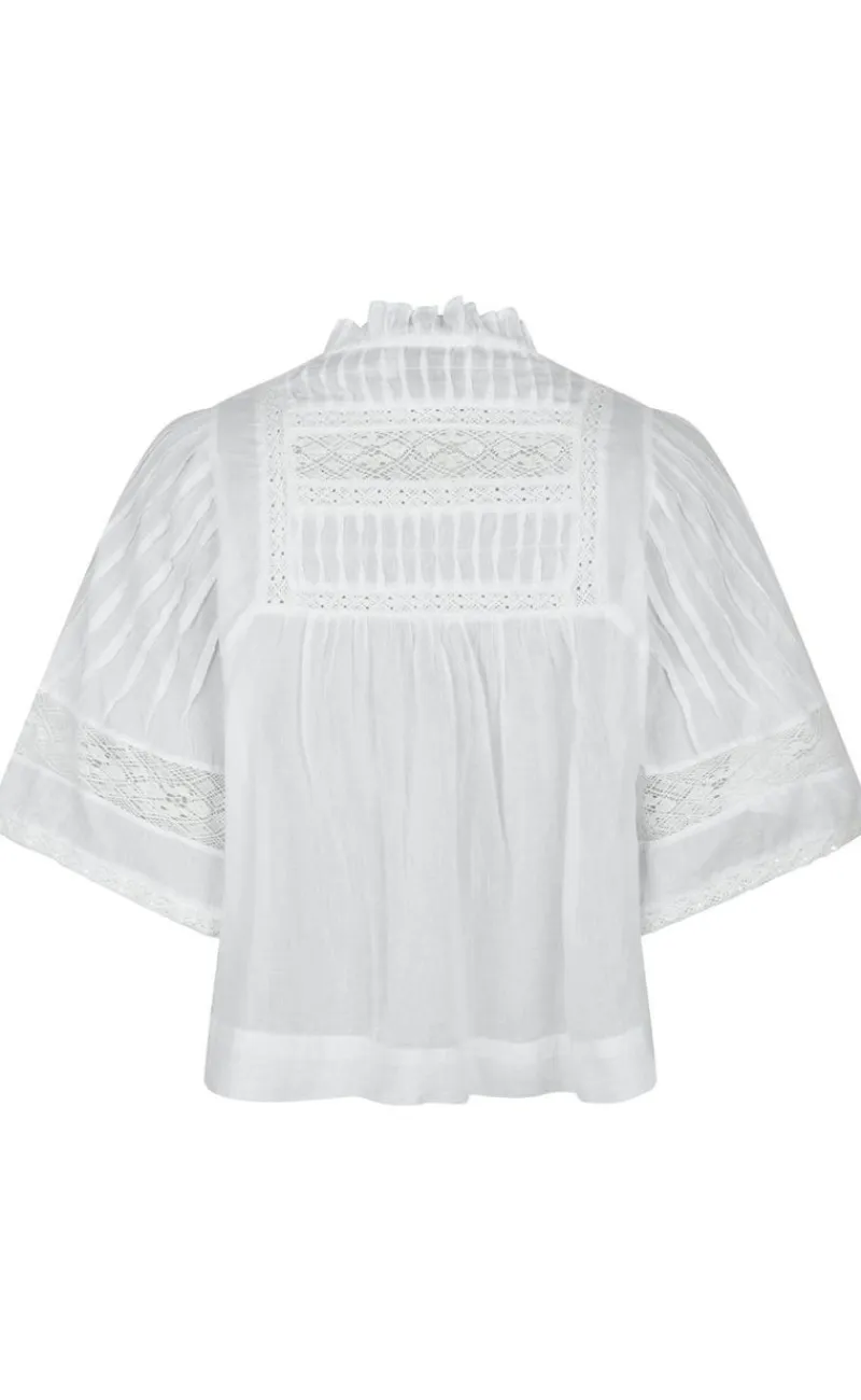 Smuk og feminin bluse i hvid fra Neo Noir med mange smukke detaljer i form a bånd påsætninger og små læg.