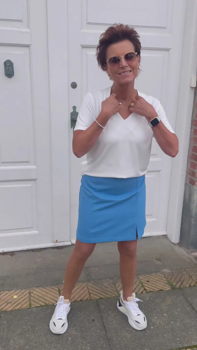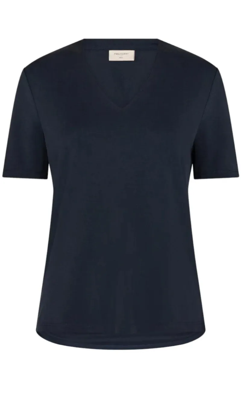 Blusen er kortærmet, har en afslappet pasform og en dyb v-udskæring.