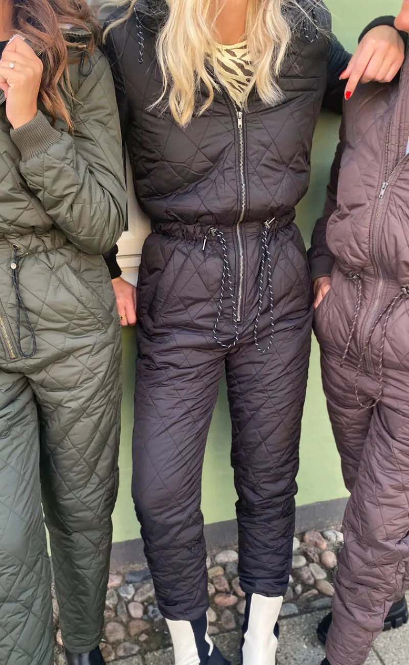 Flyverdragten er fremstillet i en quiltet kvalitet og lukkes med lynlås på fronten. Der er åbne lommer i siderne og elastik i taljen med snøre, som sikrer en feminin pasform.
