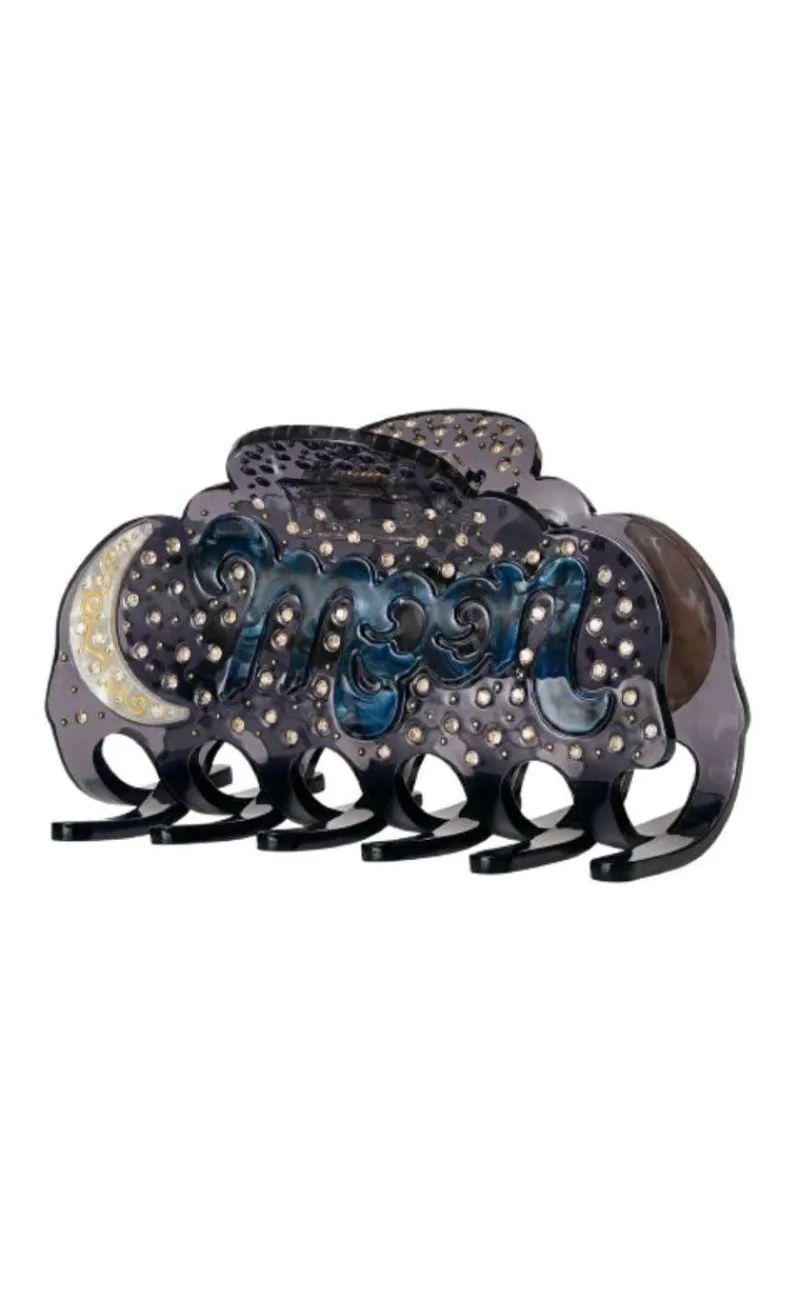 Den magiske hårklemme, Cosmo, er dekoreret med en skinnende halvmåne, og så er ordet Moon skrevet på fineste vis. Den er skabt i et transparant sort acetat og dekoreret med lyse krystaller, der ligner stjerner på nattehimlen.