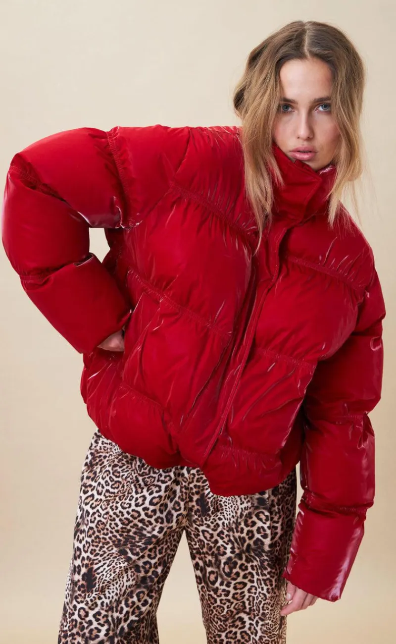 Rød og hyggelig dynejakke med lynlås. Jakken har en høj krave, der holder dig varm hele vinteren. Den røde jakke kan pifte ethvert outfit op i den kolde sæson.