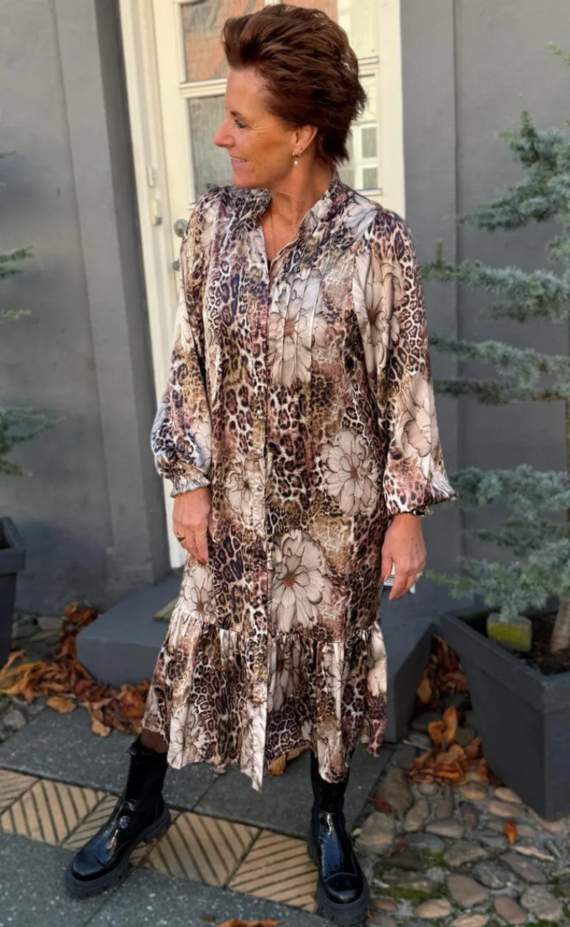 Eksklusiv kjole fra INA Copenhagen med det flotteste print leopard mønster og blomster.
