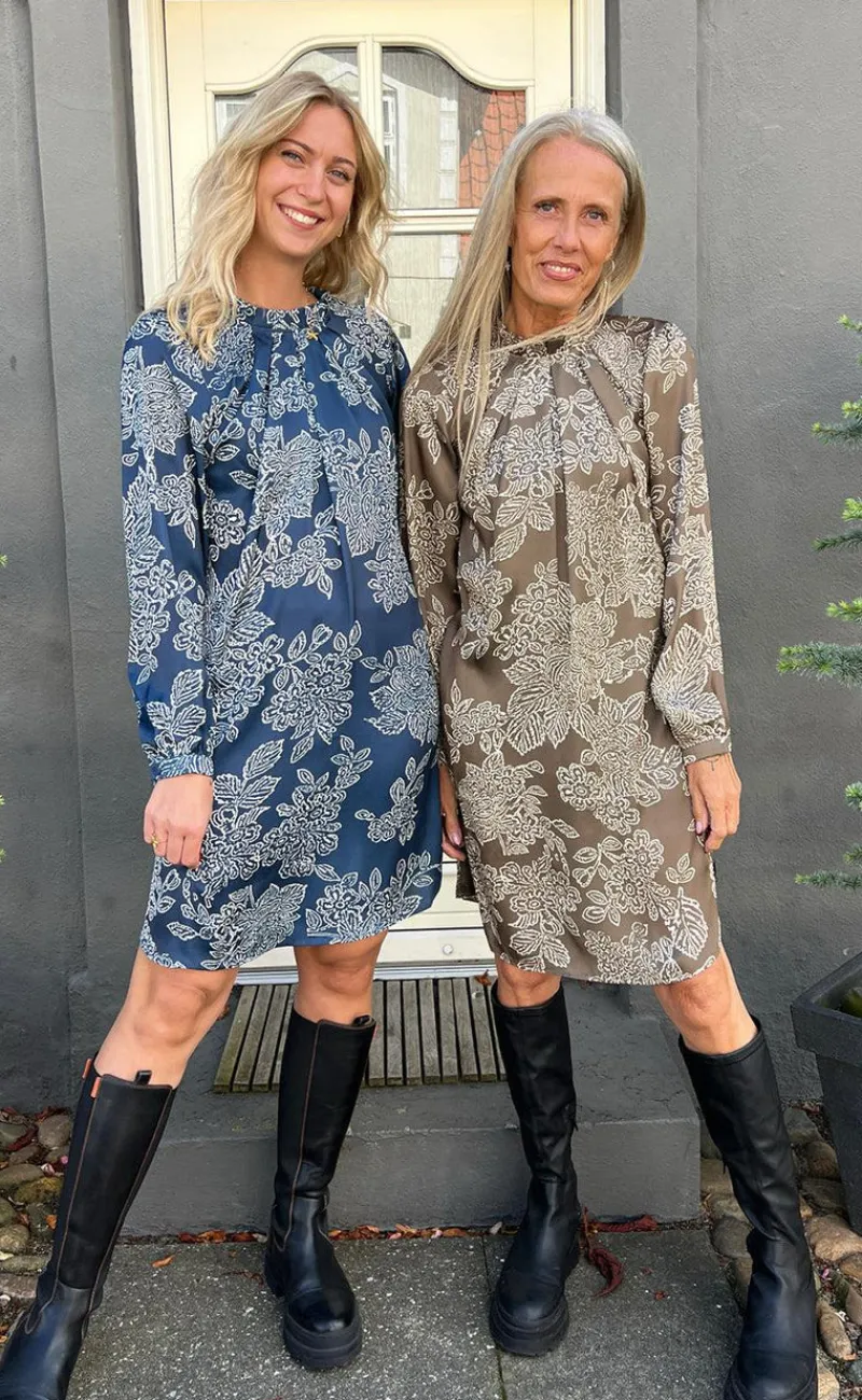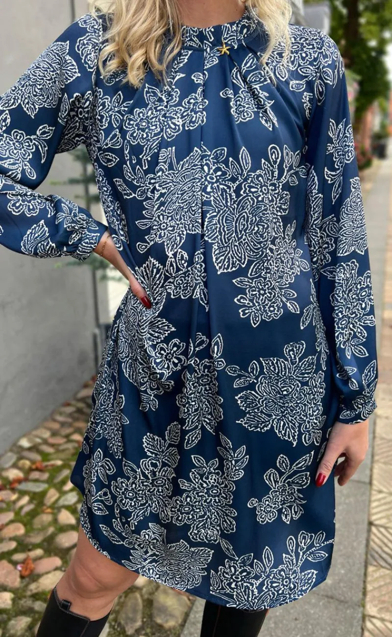 Smuk kjole fra INA Copenhagen i navy blå med de smukkeste detaljer ved halsen og fortil ved brystet.